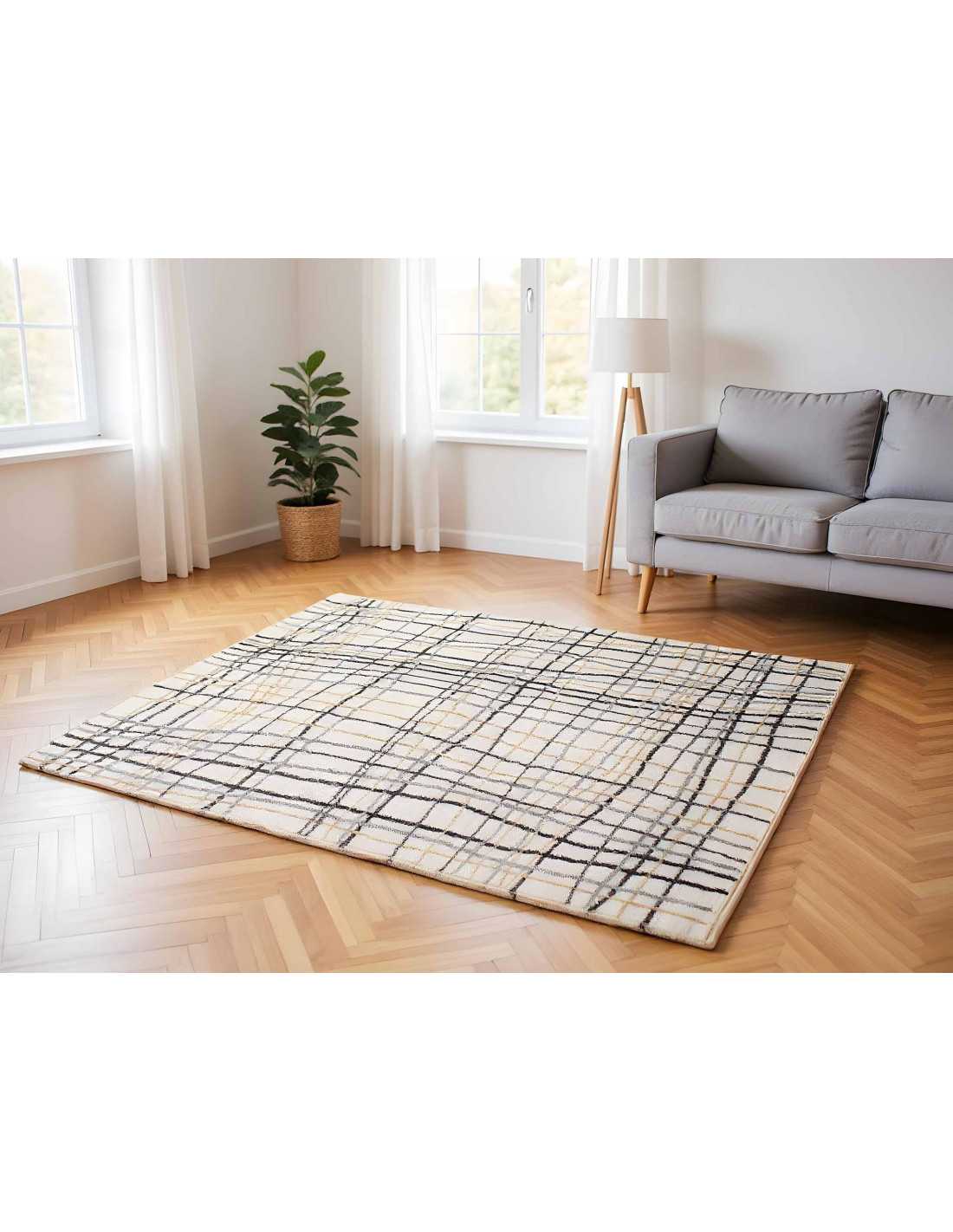Alfombra de pelo corto muy decorativa con diseño de líneas, en fondo beige ideal para decorar tu hogar. Disponible en varias medidas.