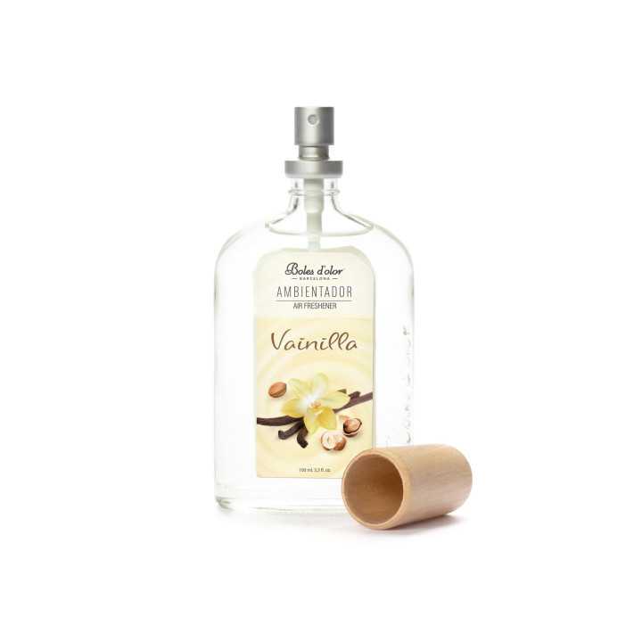 Un ambientador en spray con frasco de cristal de 100 ml con el tapón de madera.