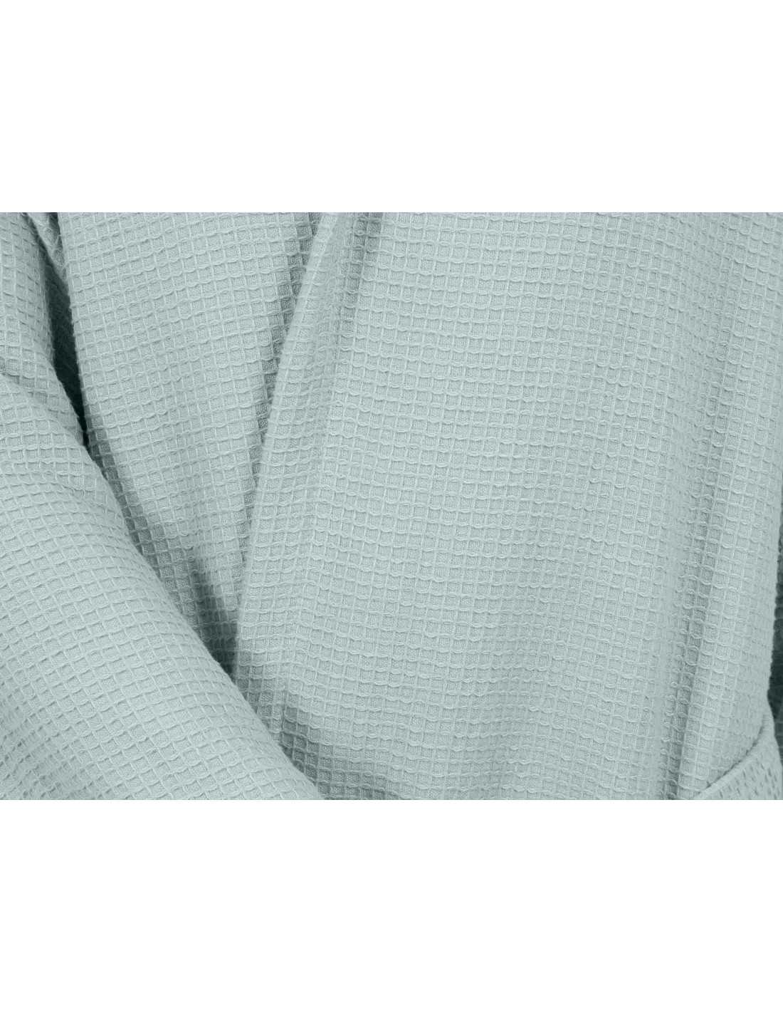 El albornoz Maya color agua, es un modelo de alta calidad con interior de rizo de 100% algodón y exterior de tejido nido de abeja de gran suavidad.