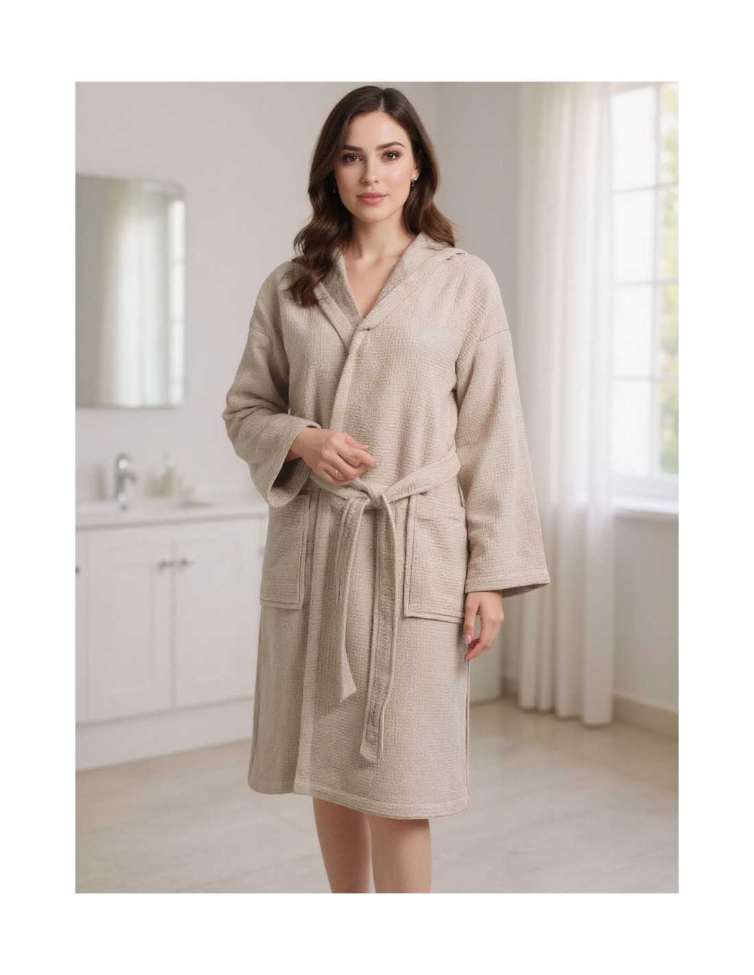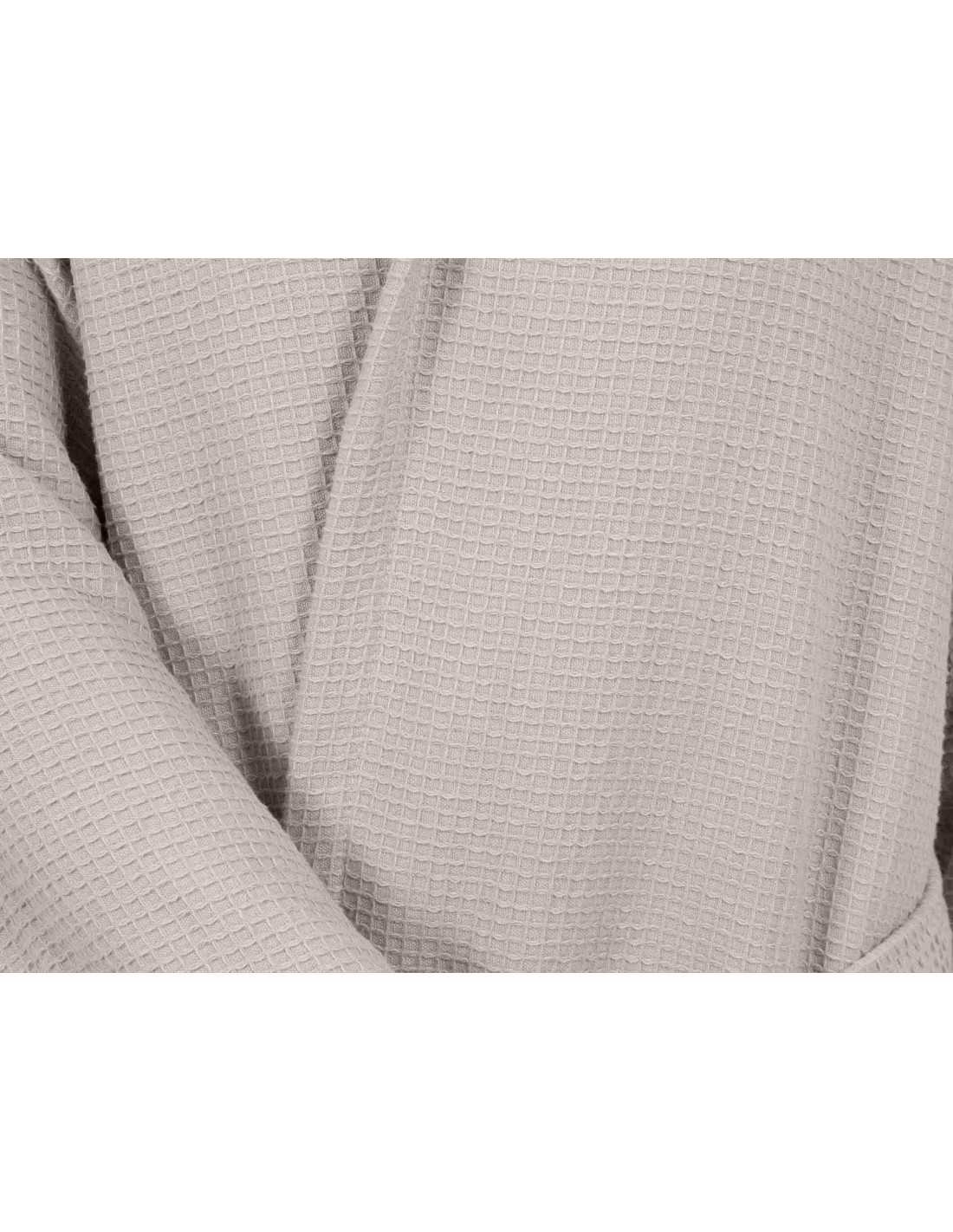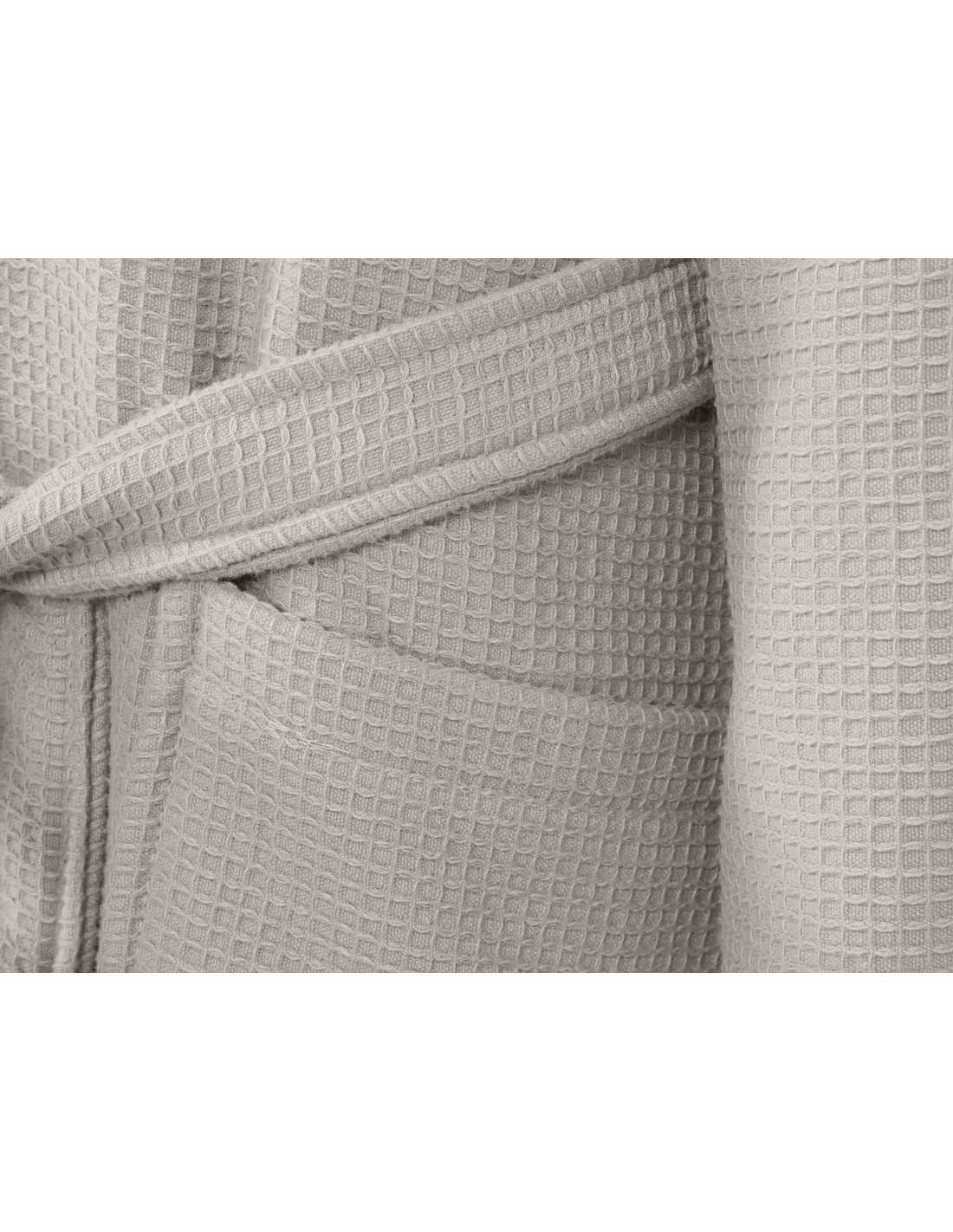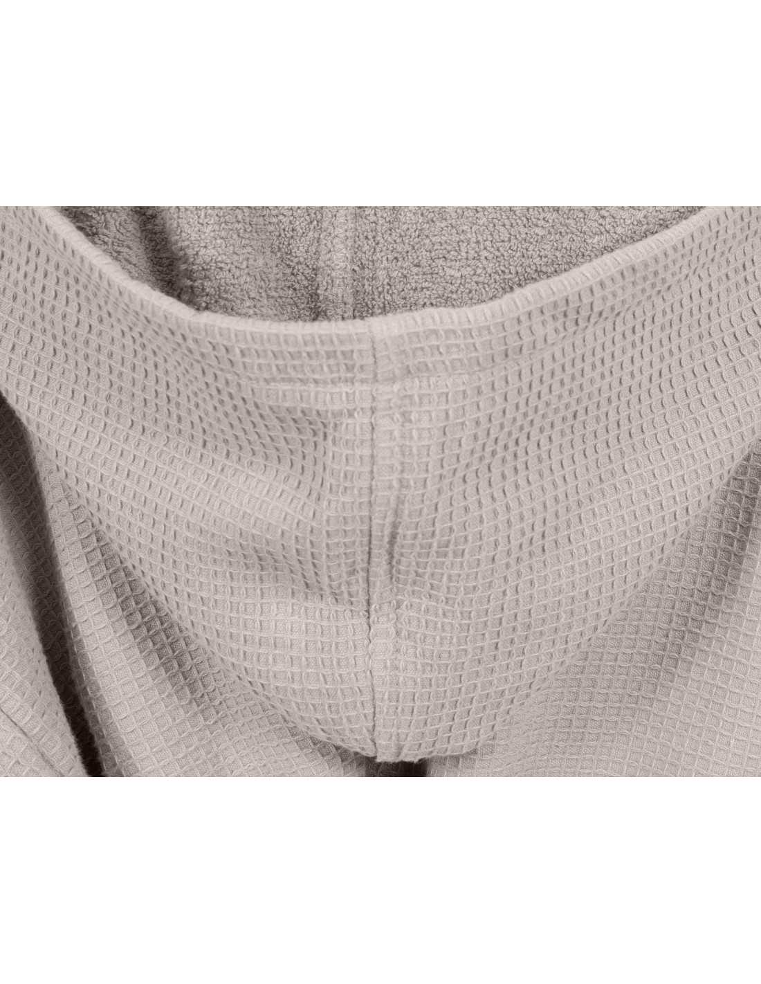 El albornoz Maya color beige, es un modelo de alta calidad con interior de rizo de 100% algodón y exterior de tejido nido de abeja de gran suavidad.