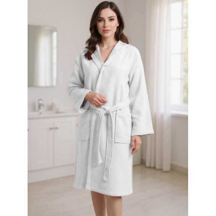 El albornoz Maya color blanco, es un modelo de alta calidad con interior de rizo de 100% algodón y exterior de tejido nido de abeja de gran suavidad.