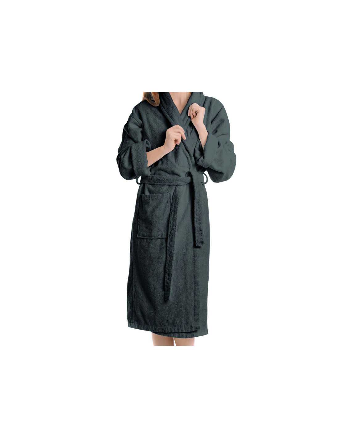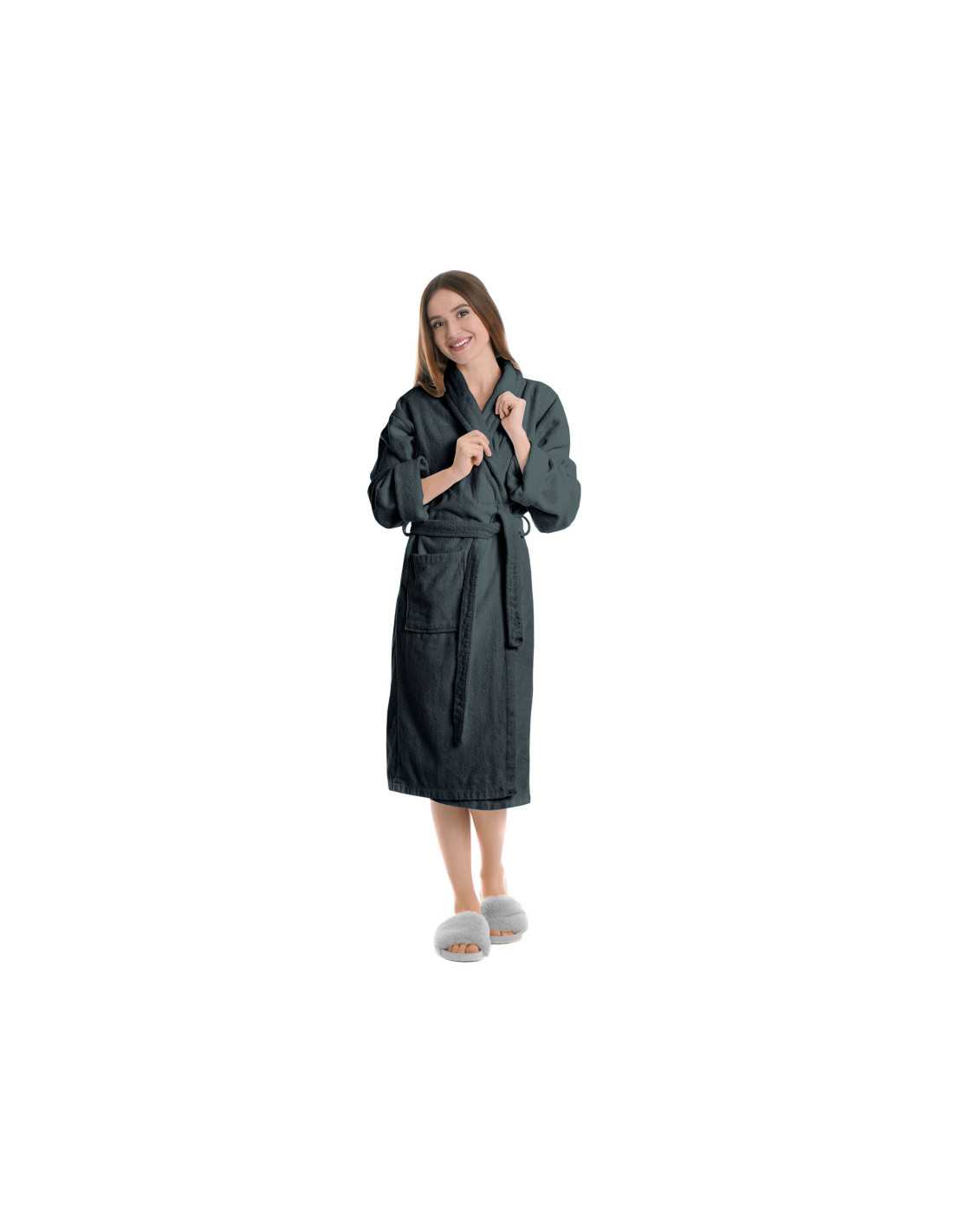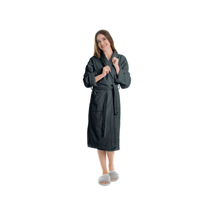 Albornoz de cuello esmoquin con dos bolsillos laterales para más comodidad y un cinturón perfectamente ajustable al cuerpo.