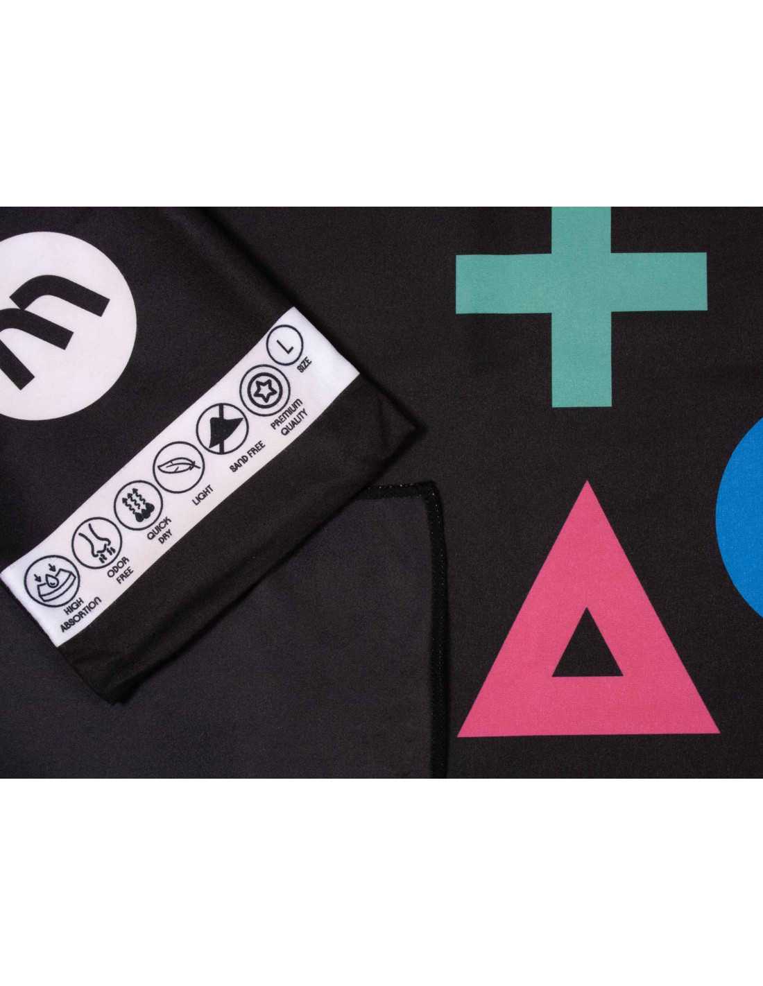 Bonita toalla de microfibra en con estampado juvenil y con texto sobre fondo negro, tiene un anillo en una esquina para colgarla y una bolsa de 16x24 cm. con cordones para cerrarla de la misma microfibra y estampado que la toalla lo que hace que sea muy cómoda de llevar.