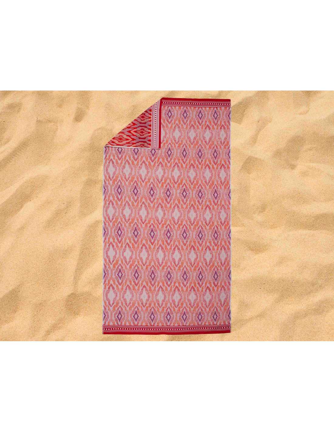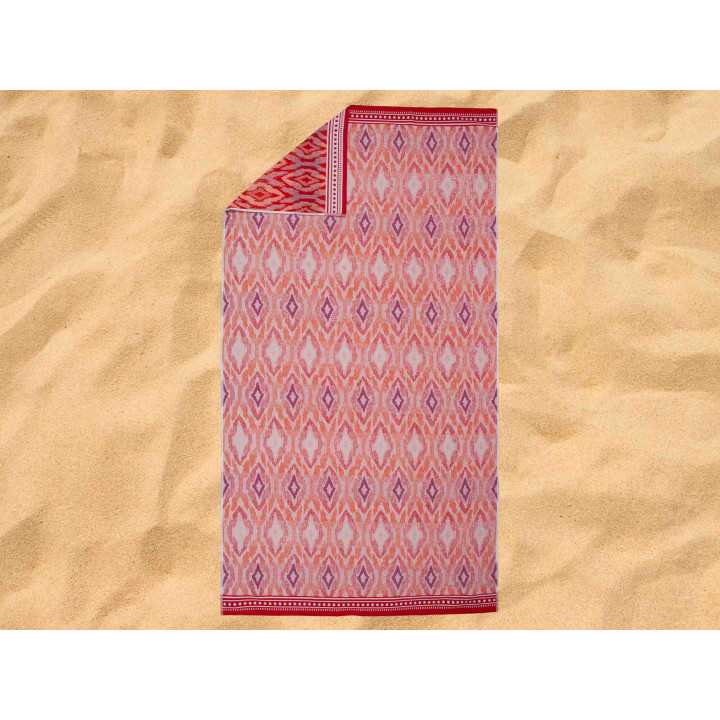 Esta toalla de playa tiene un original dibujo de rombos en tonos naranjas y cenefa de lunares en tono blanco. Un diseño moderno para estar a la última cuando vayas a la playa o la piscina.