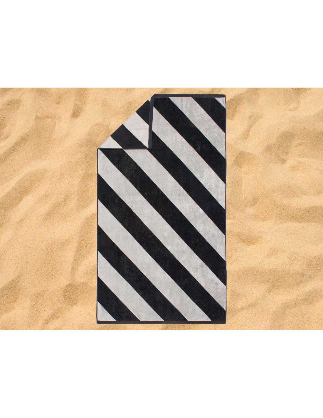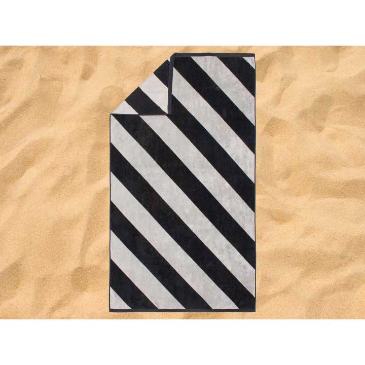 Toalla de playa y piscina de terciopelo de algodón con diseño de franjas negras y blancas. Una toalla para disfrutar del mar o la piscina con comodidad.