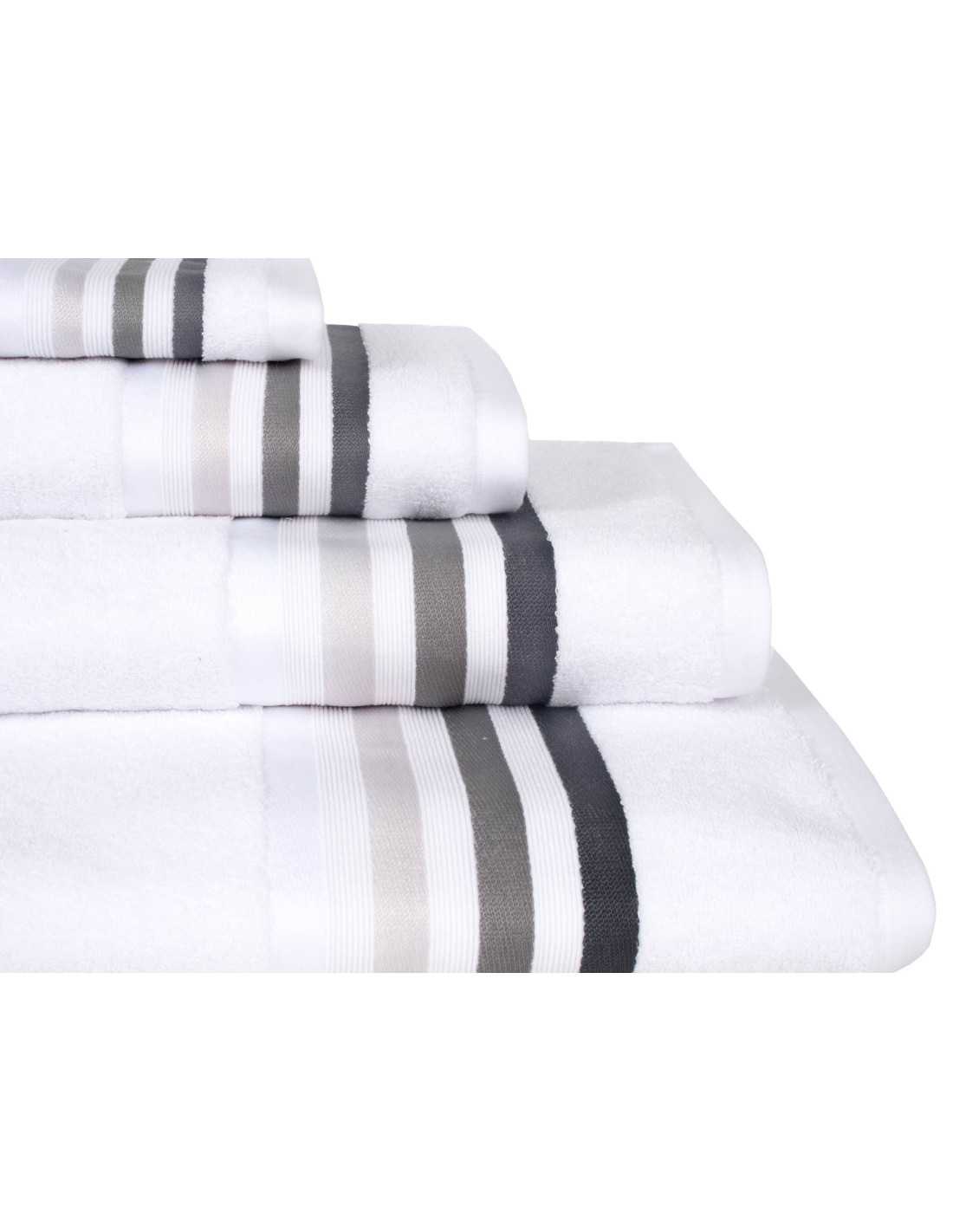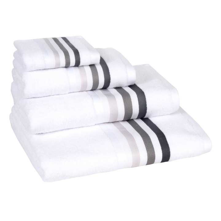 Toalla rizo de 500 g/m2 con elegante cenefa con líneas en diferentes tamaños y color blanco, confeccionada en rizo de gran calidad de algodón ¡Lo mejor para el baño!
