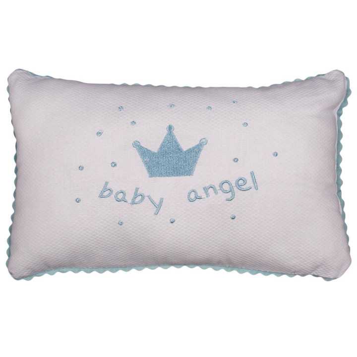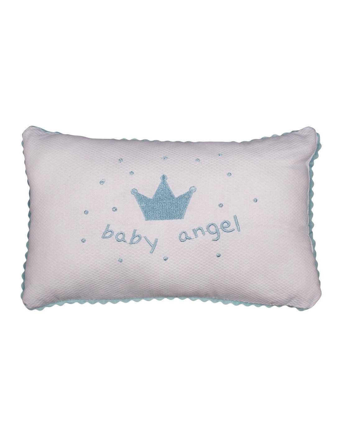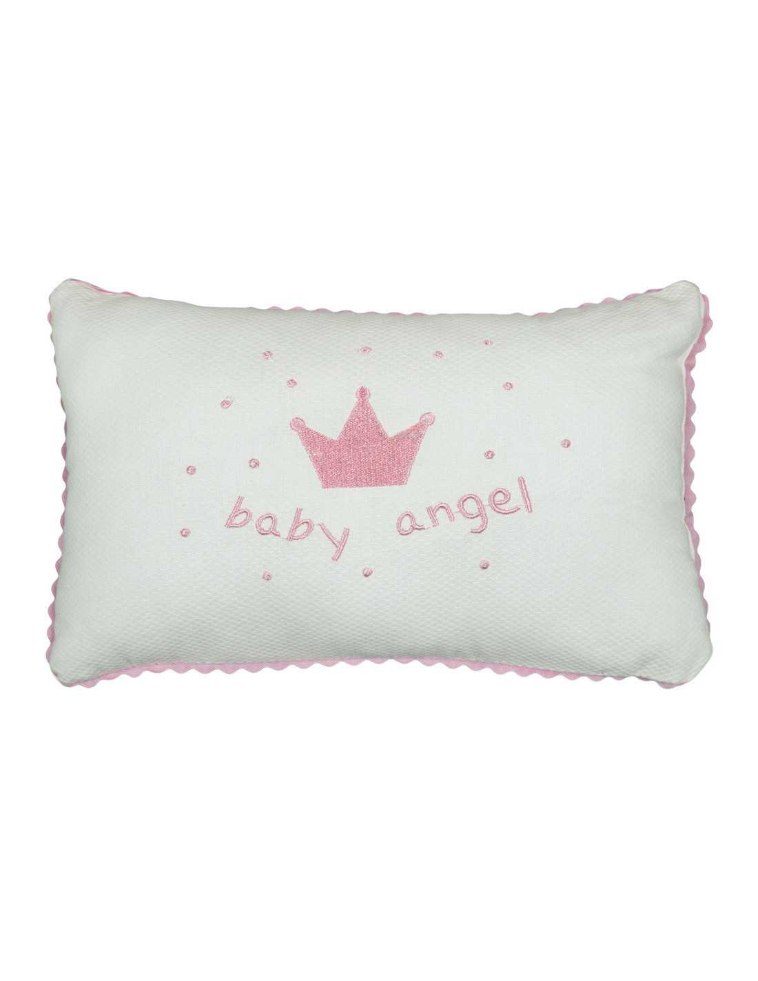 Un precioso cojín con "Baby Angel" bordado con letras en dos colores a elegir sobre fondo blanco. Un cojín para decorar la cuna, para regalar al recién nacido, para el cochecito...