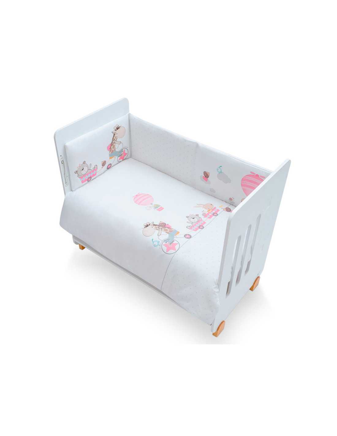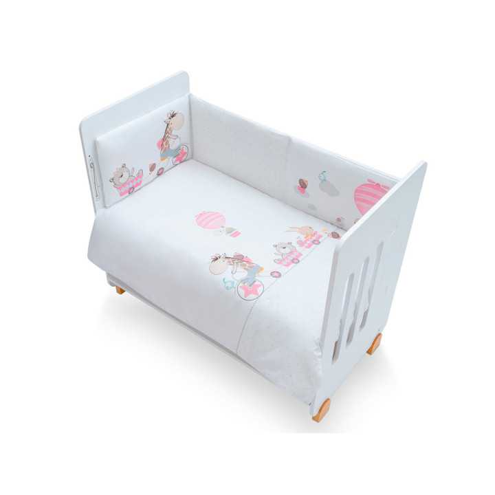 Funda nórdica con relleno incluido y protector para vestir la cuna y proteger a tu bebé. Con un diseño divertido con animalitos en tonos rosas.