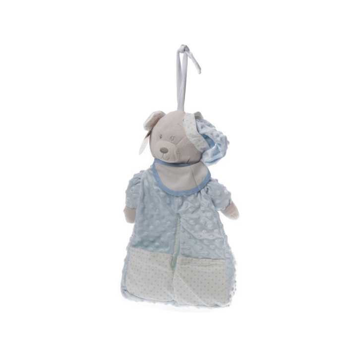 Gracioso muñeco para tener ordenados y siempre a mano los pañales. Es un osito con gorrito de dormir y un pijama donde se guardan los pañales. Un accesorio que hará más cómodo y rápido el cambio de pañal de tu bebé. Además cuenta con una tira en su gorrito para que puedas colgarlo de la parte que quieras del dormitorio del bebé.