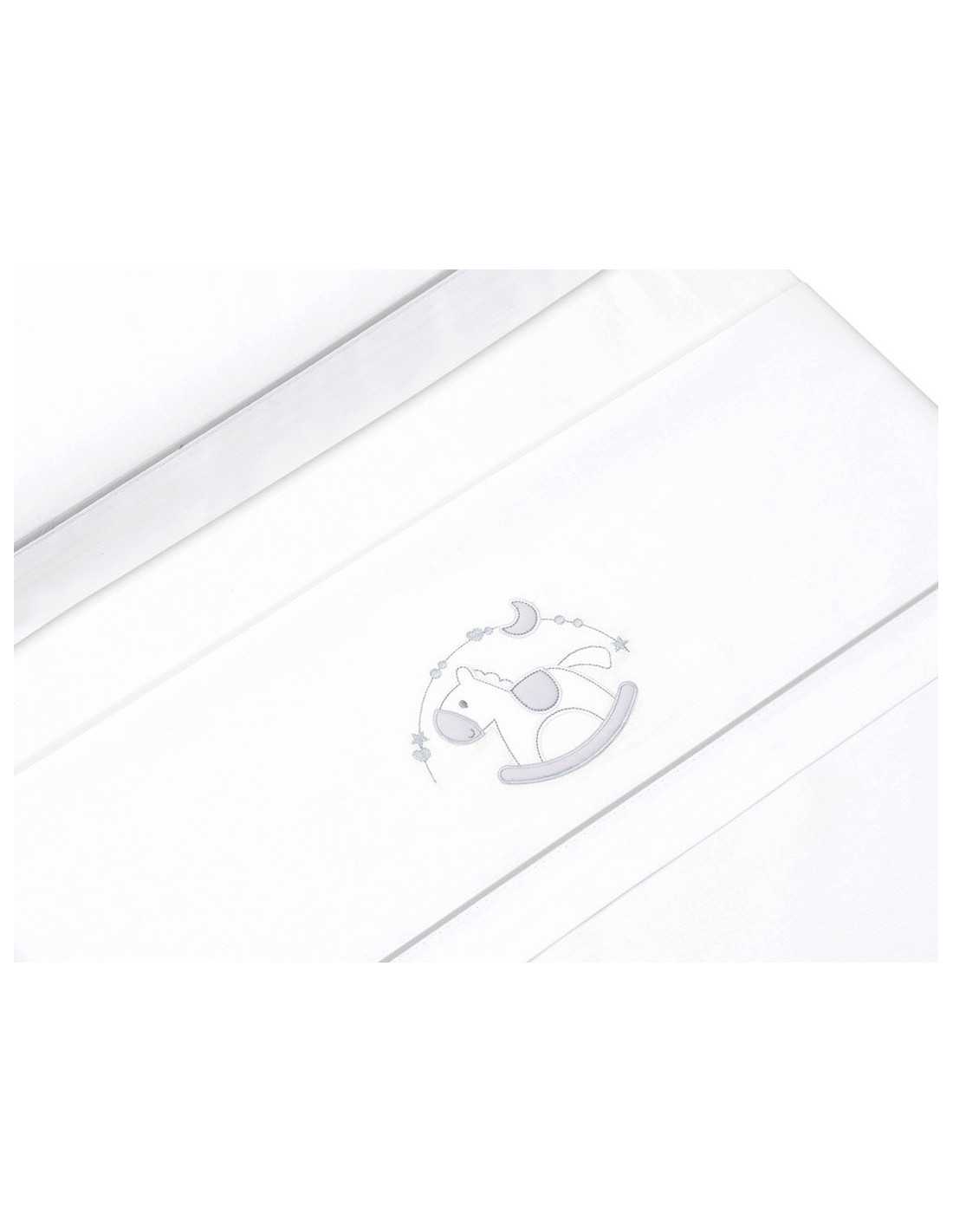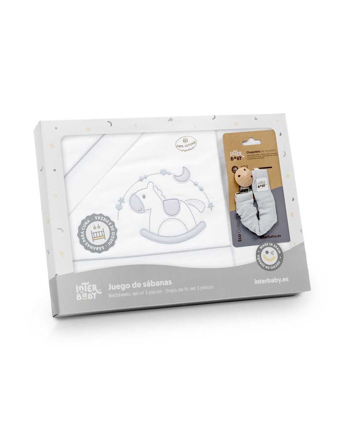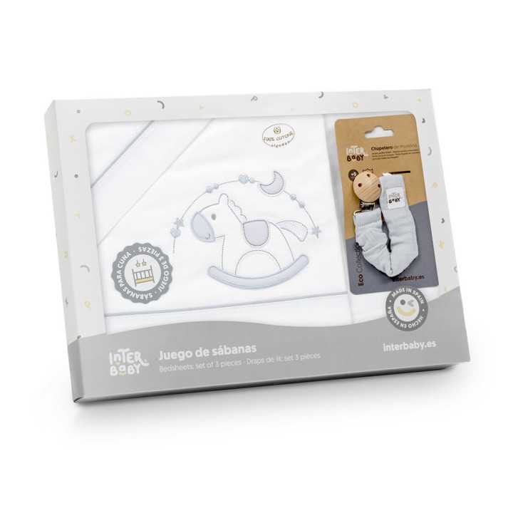 Precioso conjunto de 3 piezas para cuna modelo Balancín en color gris, con chupetero de regalo. Incluye tres piezas para cuna: encimera, bajera y almohadón.