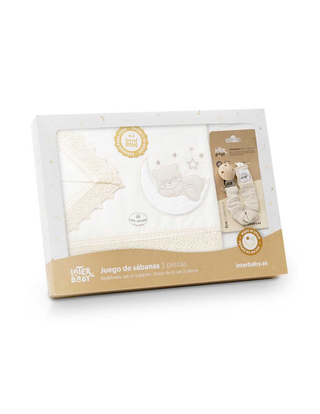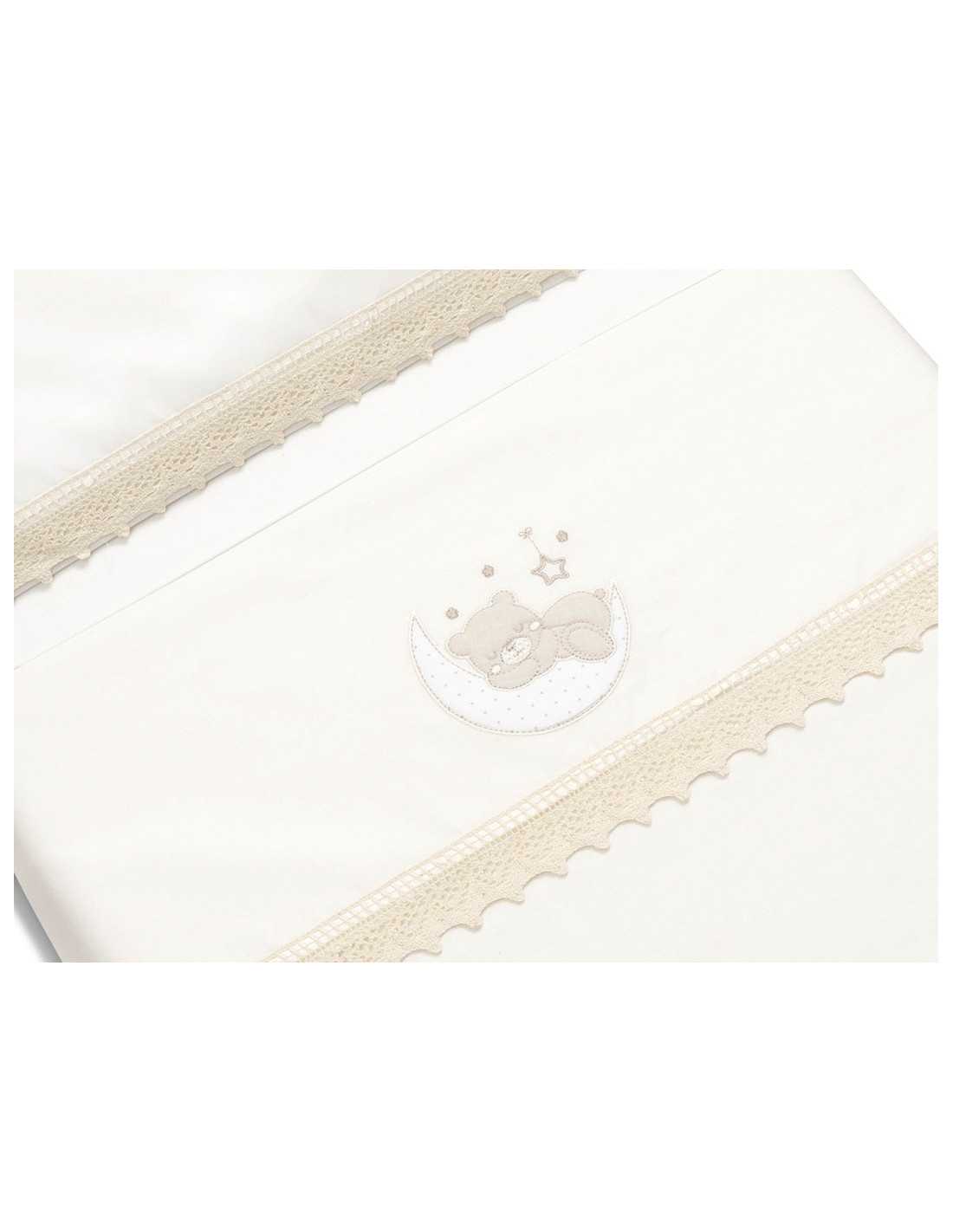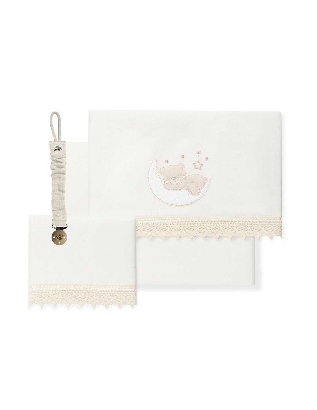 Juego de cuna de 3 piezas Oso Luna beige con chupetero de regalo. Incluye encimera, bajera y almohadón. 100% algodón