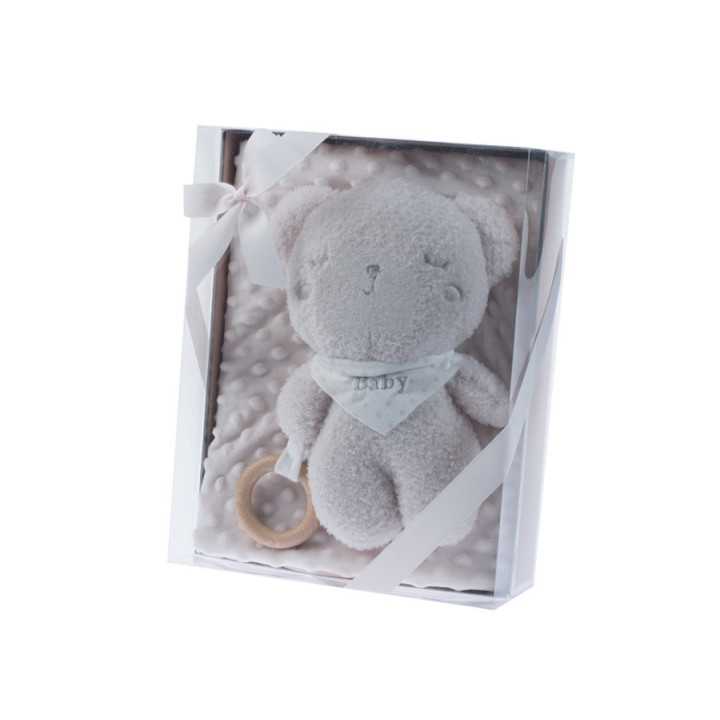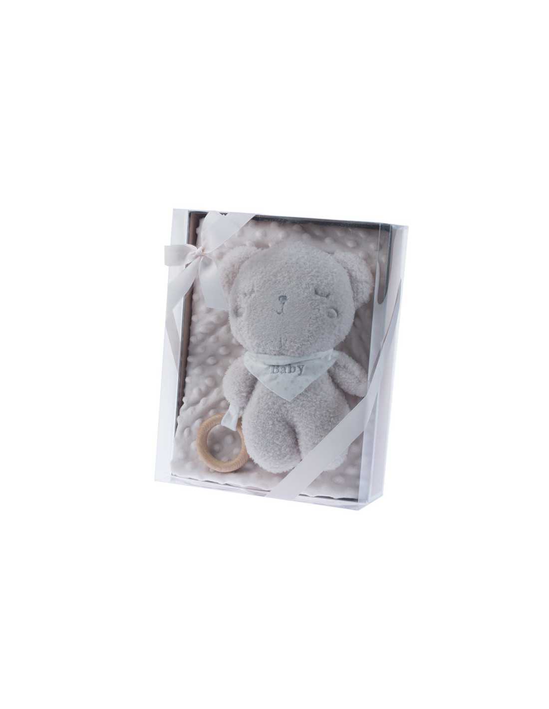 Preciosa manta aterciopelada muy suave y calentita con diseño de topos en relieve y medida de 80x110 más un muñeco en forma de osito con un aro de madera para que tú bebé se entretenga mordiéndolo, agarrándolo y tocándolo. Todo ello confeccionado en 100% poliéster de la mejor calidad y presentado en caja para regalo.