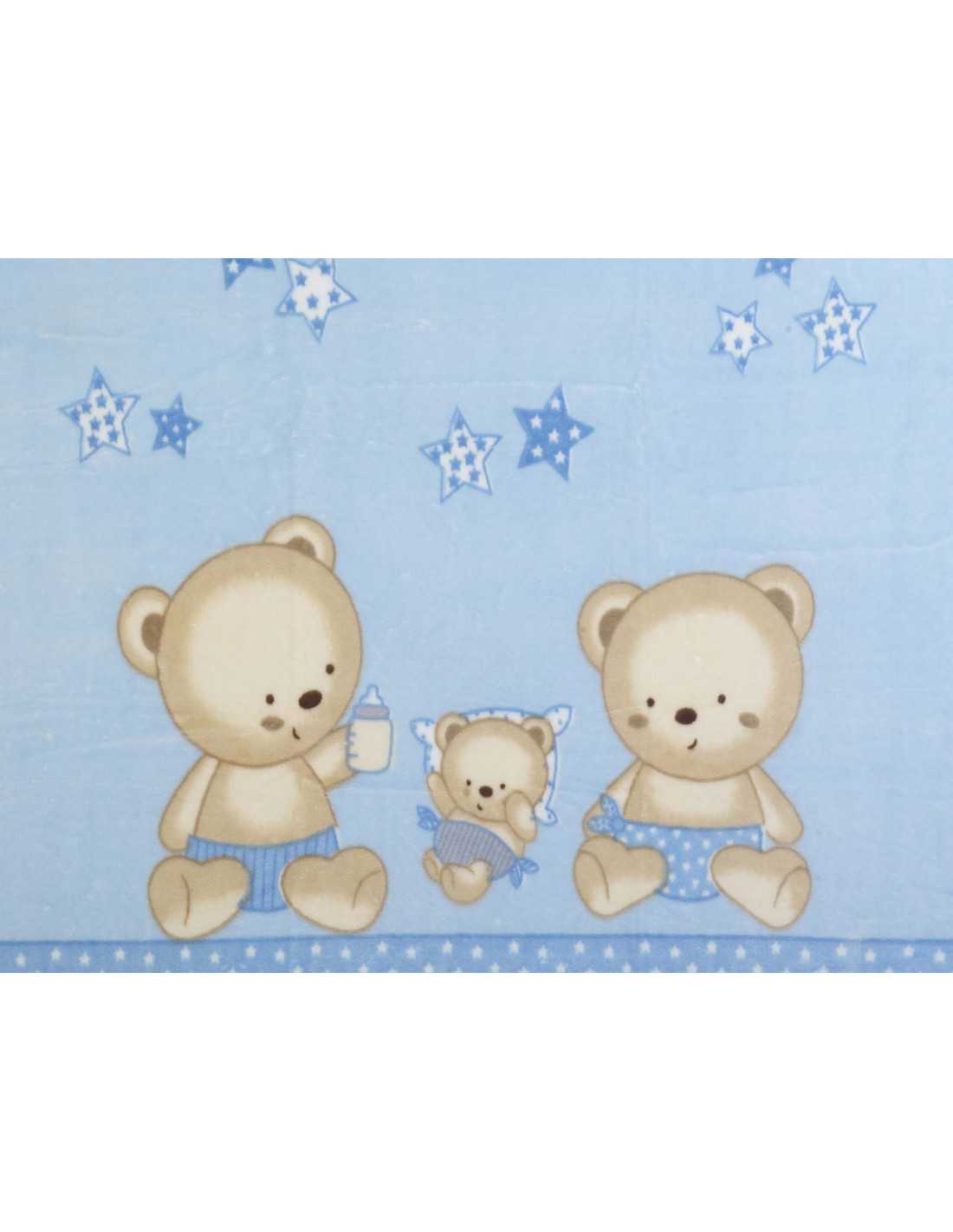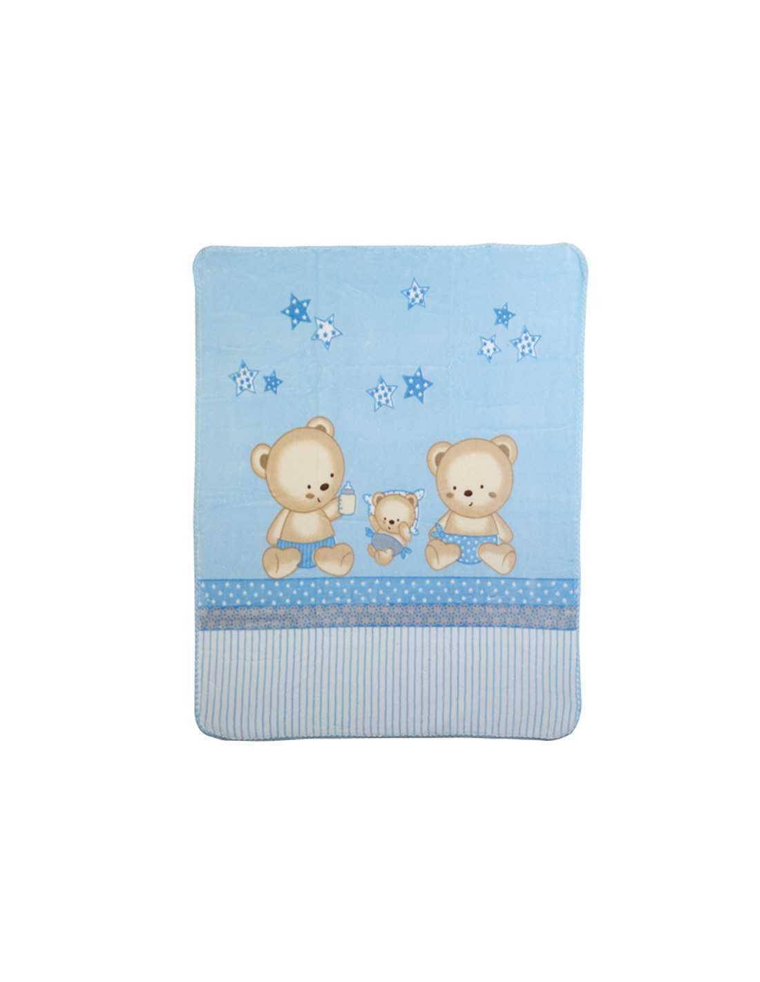 Manta infantil de tacto terciopelo con una preciosa ilustración con una divertida familia de ositos, en color azul principalmente.