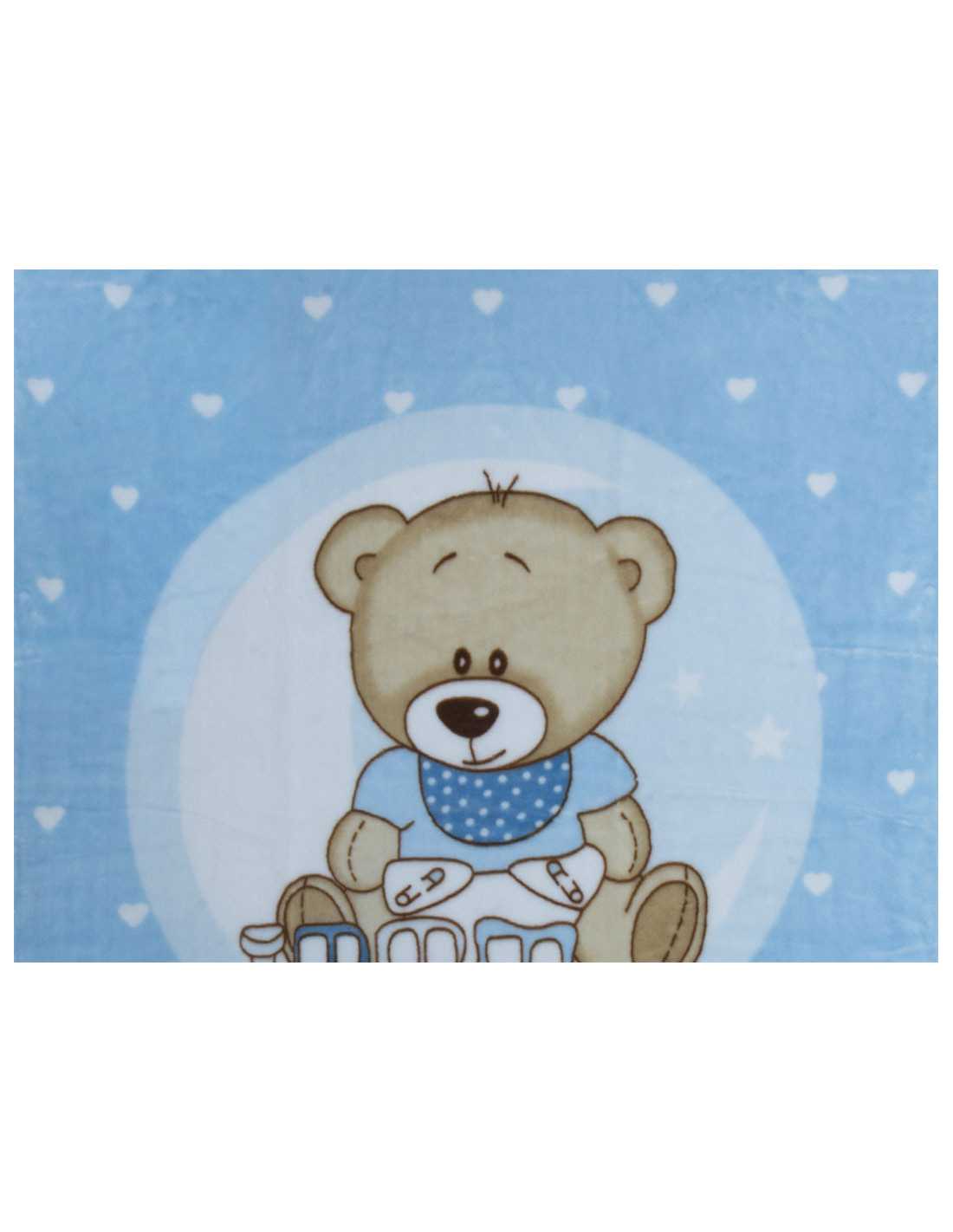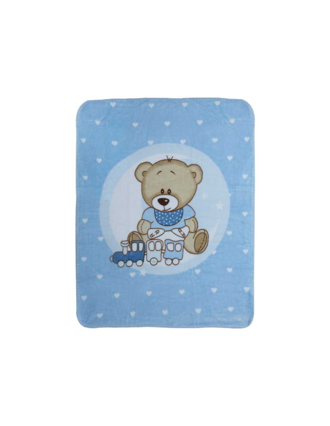 Manta infantil de tacto terciopelo con una preciosa ilustración muy amorosa con un osito jugando con un trenecito de juguete, en color azul principalmente.