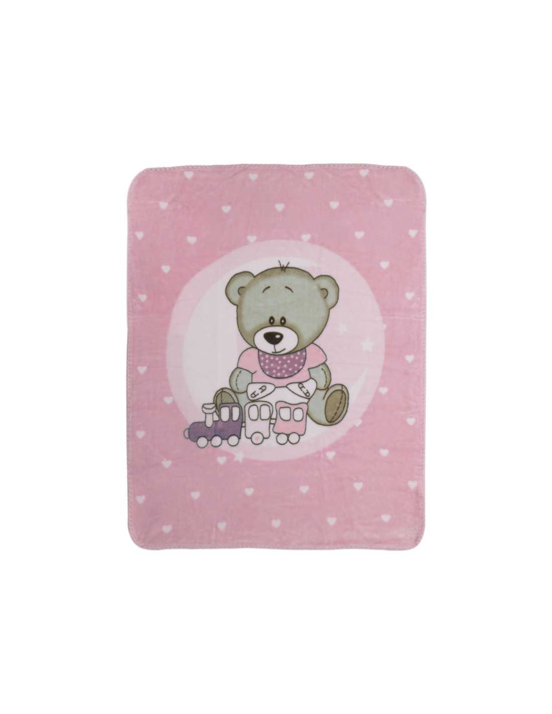 Manta infantil de tacto terciopelo con una preciosa ilustración muy amorosa con un osito jugando con un trenecito de juguete, en color rosaprincipalmente.