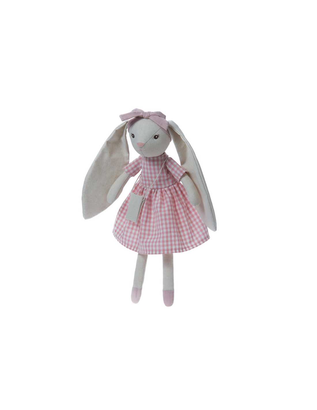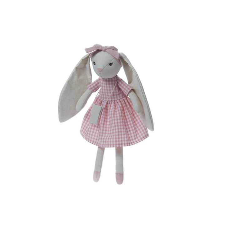 Precioso Peluche con forma de conejita con vestido de cuadros rosas, que encantará y entretendrá a los más peques de la casa.