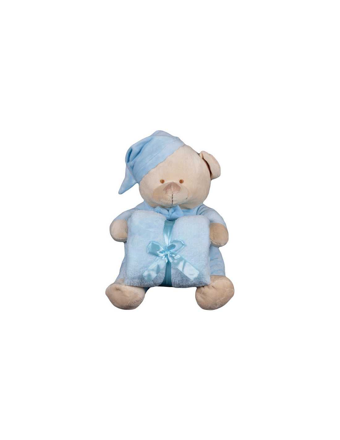 Tierno osito acompañado de una mantita de tacto coral. El peluche viste pijama con pajarita y un simpático gorro de dormir disponible en diferentes colores. La manta de coche a juego es extrasuave.