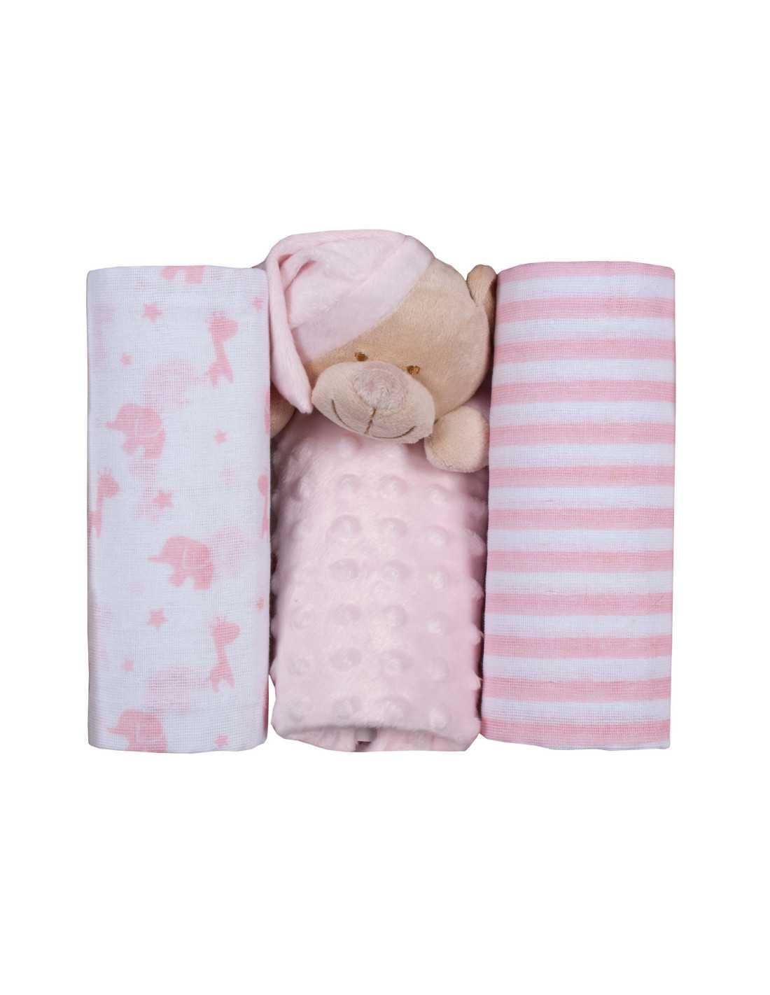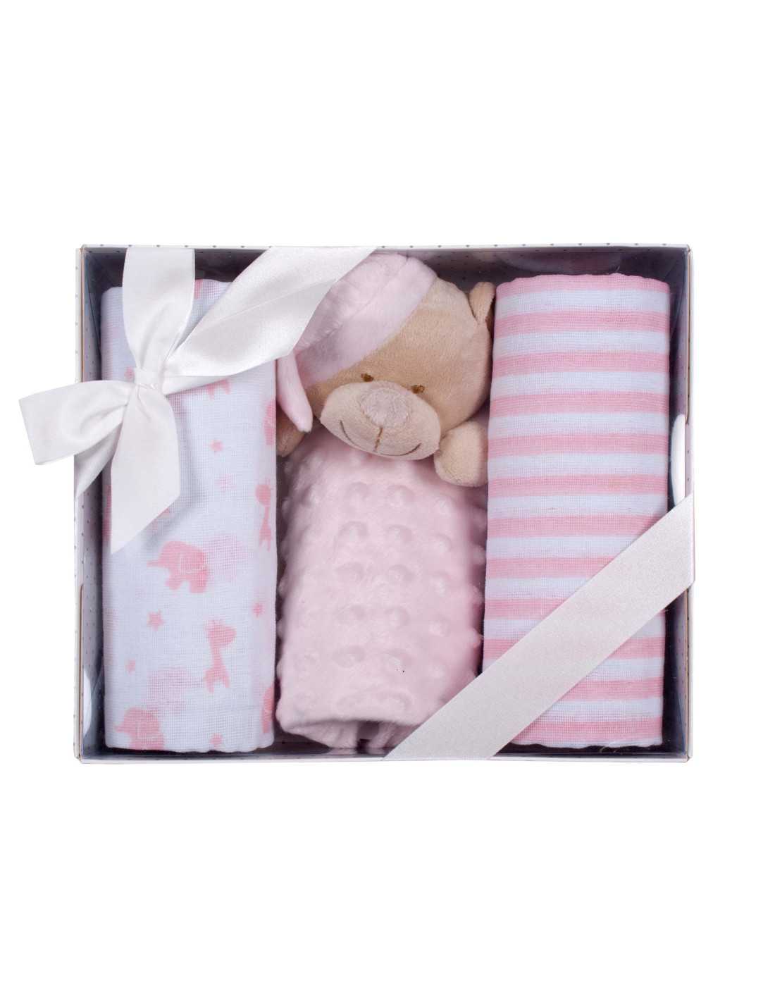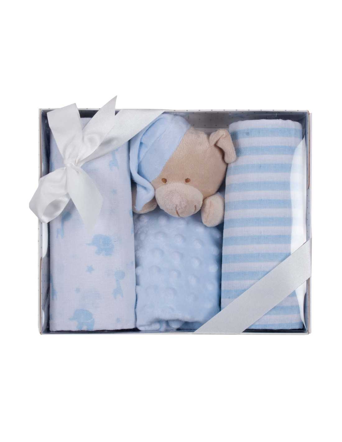 Set infantil compuesto por un doudou y 2 gasas muy suaves. Perfecto para tu bebe o para regalar.