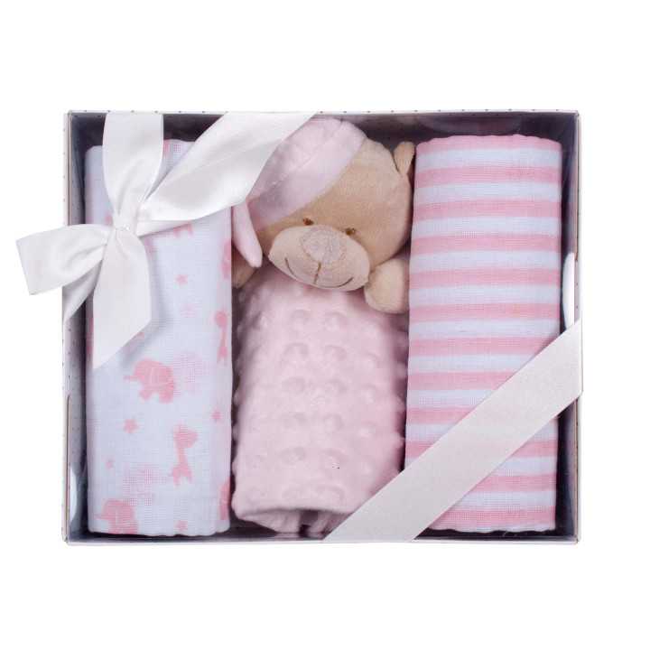 Set infantil de 3 piezas formado por un doudou muy amoroso de 25x25 cm. con relieve de topitos y forma de osito dormilón, y dos gasas muy suaves de 45x45 con decoración de animales y rayas. Es ideal para regalo de recién nacido o para nuevas mamás.