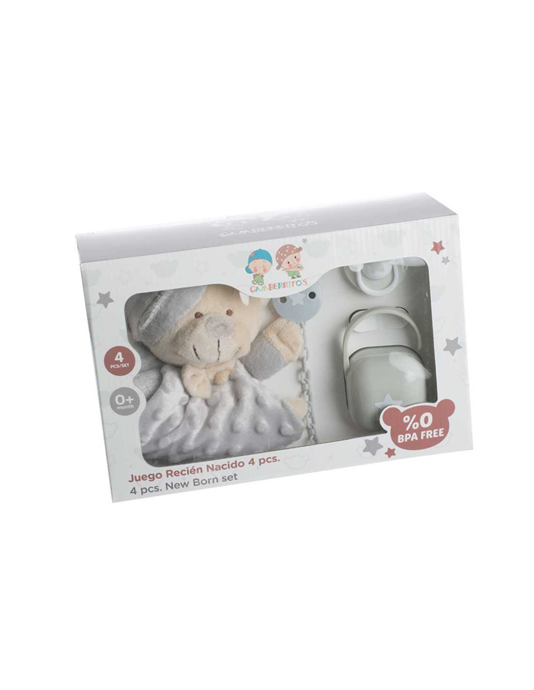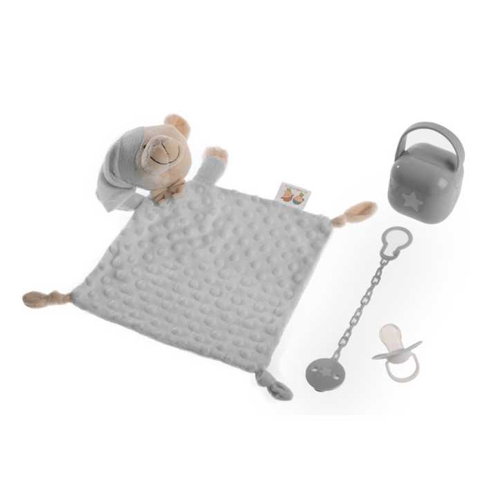 Juego recién nacido de 4 piezas que contiene un gracioso dou dou de osito, un chupete , caja portachupete y una cadena de chupete, todo ello cumple con la normativa EN1400 y EN12586.