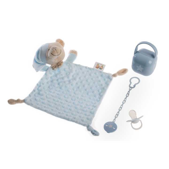 Juego recién nacido de 4 piezas que contiene un gracioso dou dou de osito, un chupete , caja portachupete y una cadena de chupete, todo ello cumple con la normativa EN1400 y EN12586.