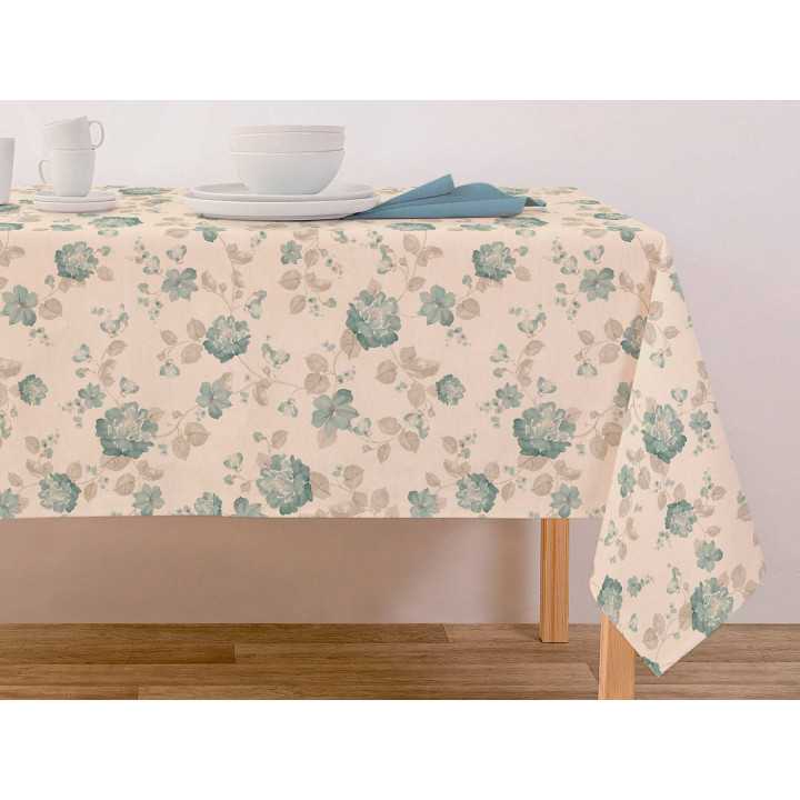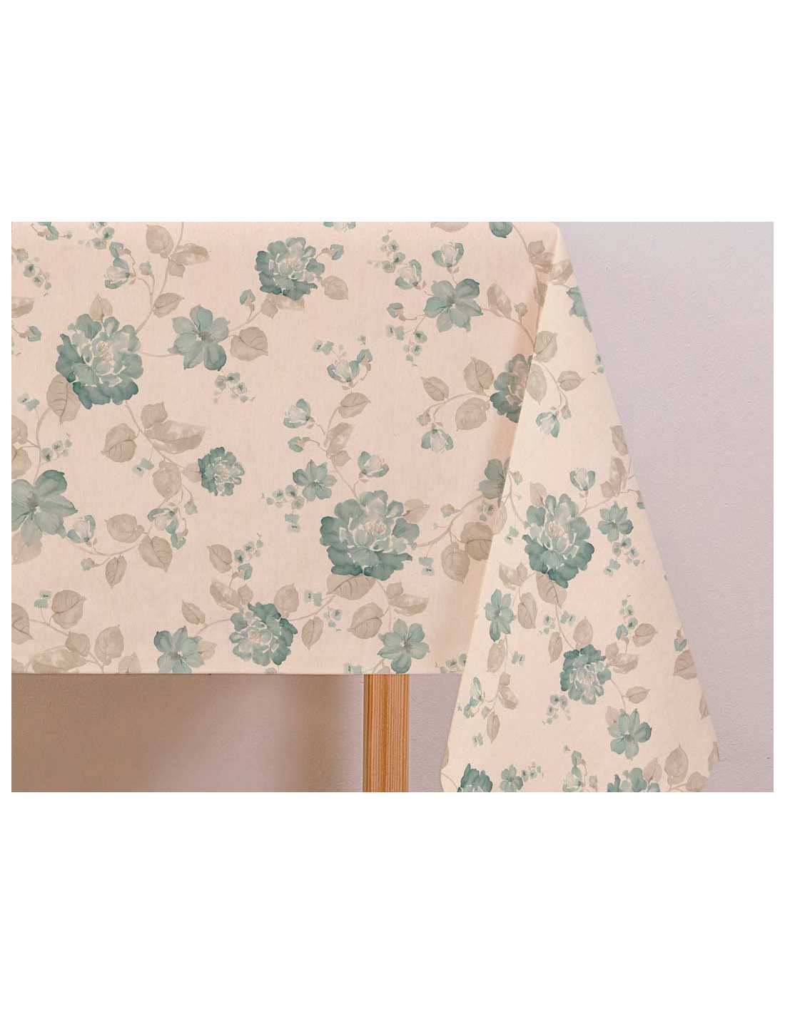 Bolwel es un mantel antimanchas con un estampado floral verde y gris sobre un fondo beig que vestirá tu mesa con alegría.