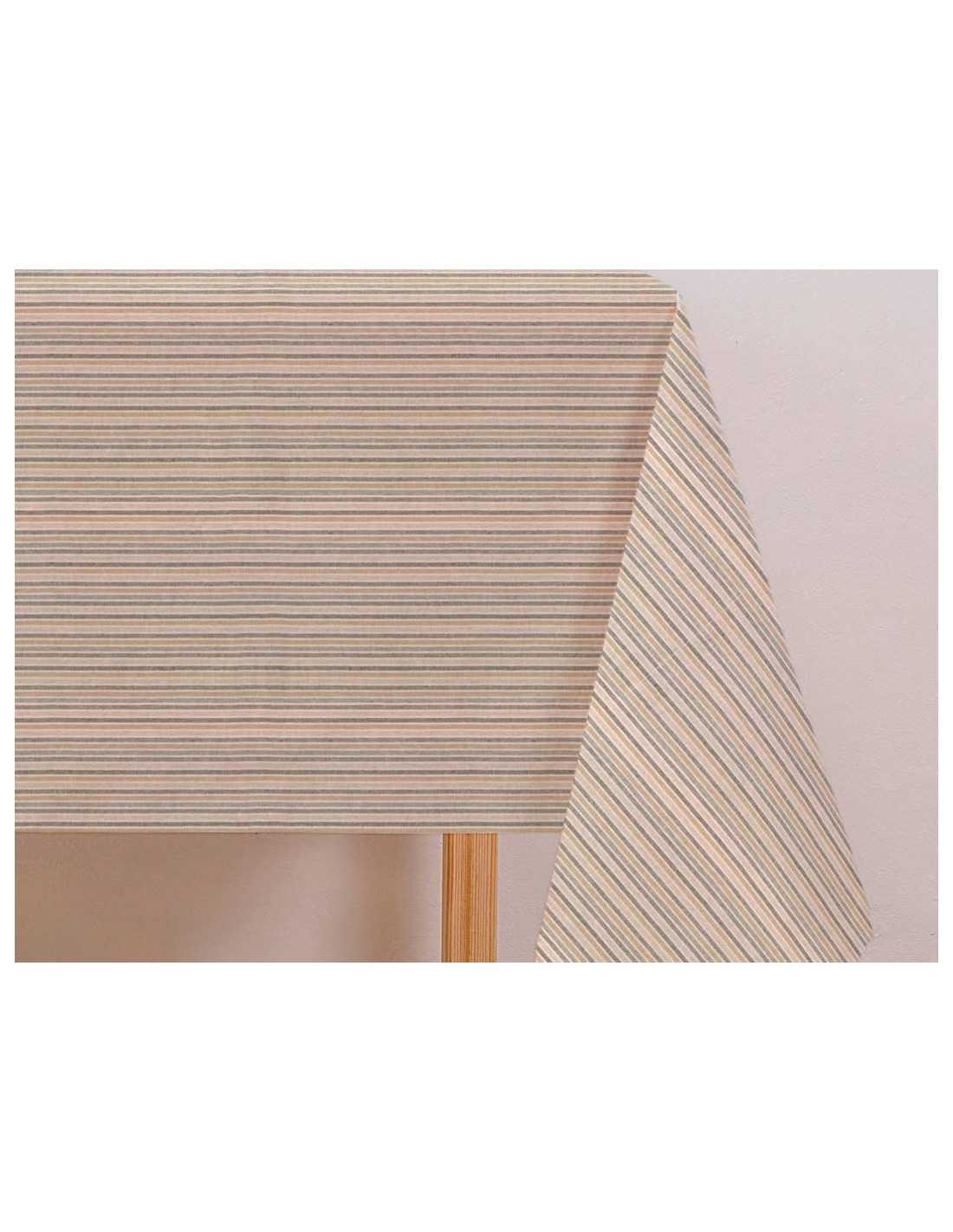 Casica es un mantel antimanchas con un estampado de rayas en tonos grises y beiges que vestirá tu mesa con alegría.
