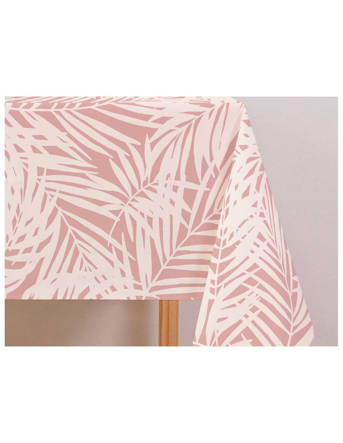 Retmal es un mantel antimanchas con un estampado vegetal sobre fondo rosado que vestirá tu mesa con estilo.
