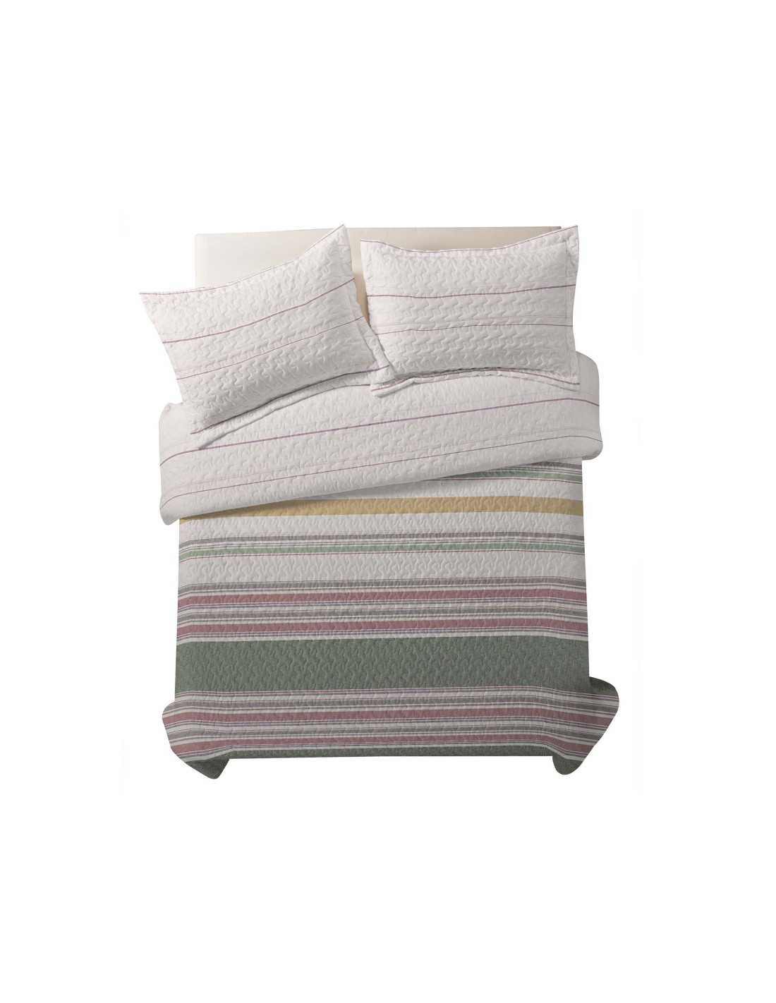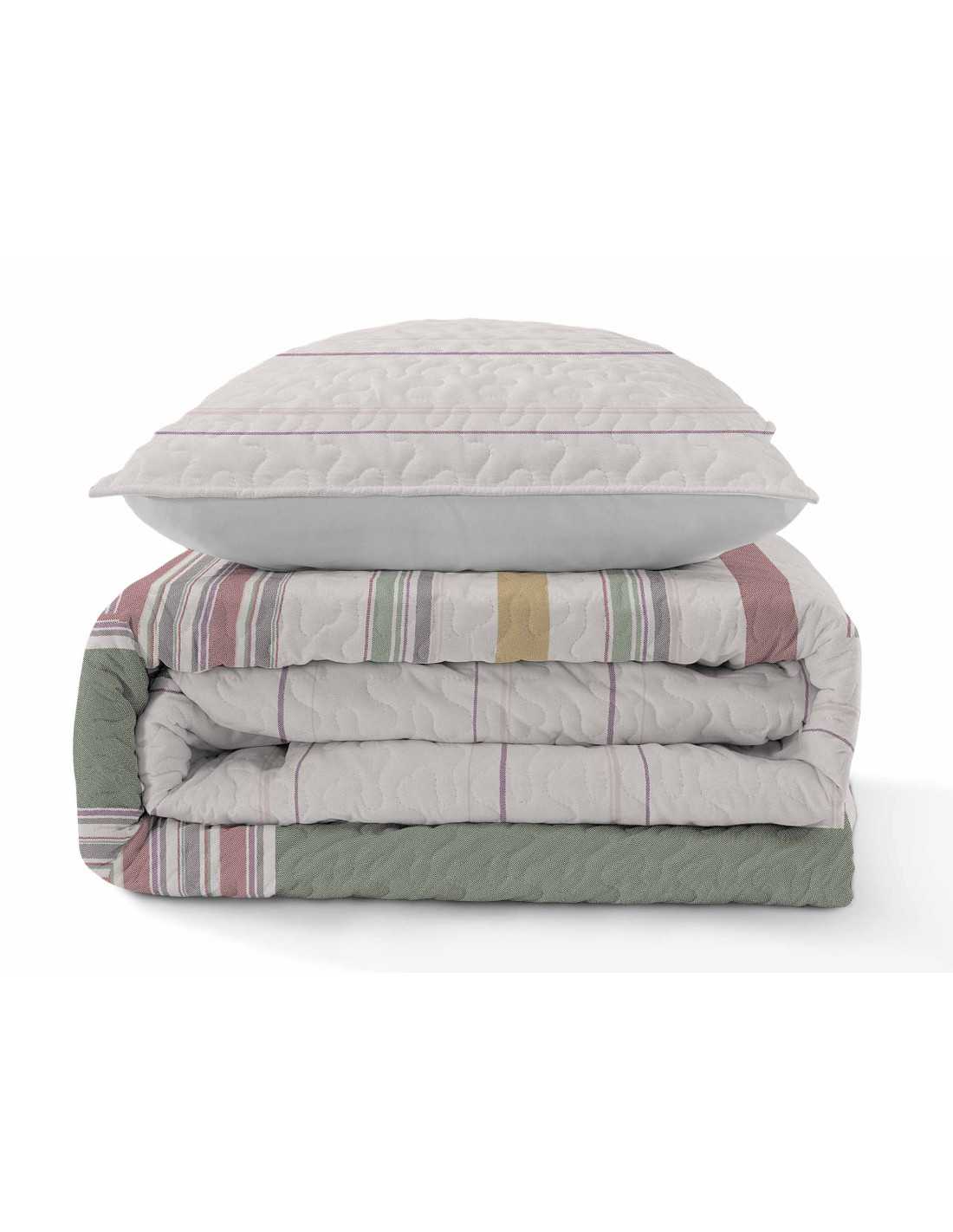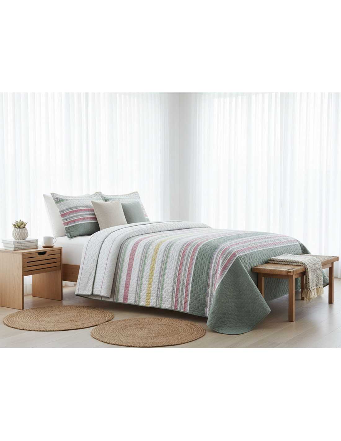 Colcha bouti de entretiempo y verano con relleno ligero. Con un estampado de rayas en varios tonos, muy sencillo y elegante.