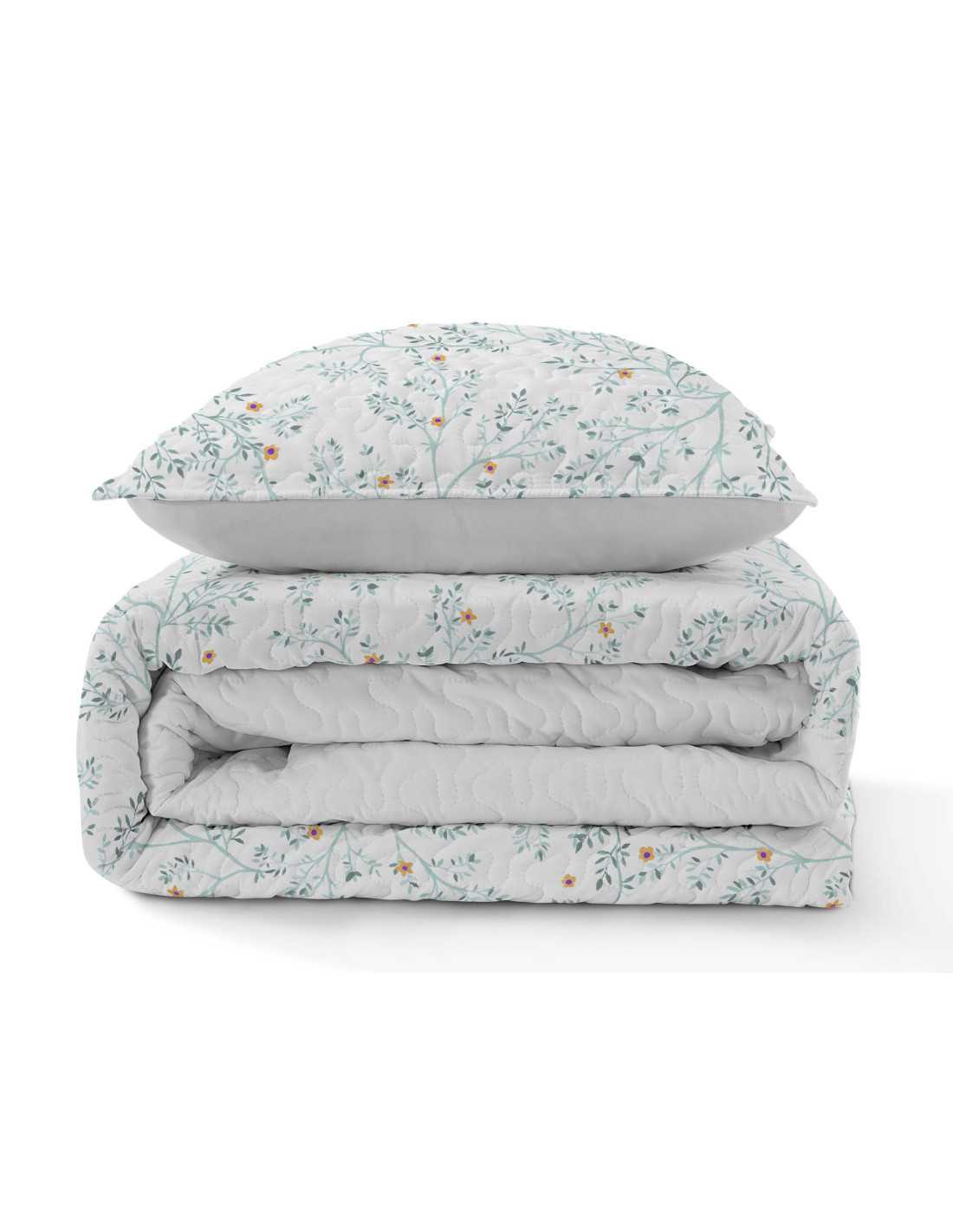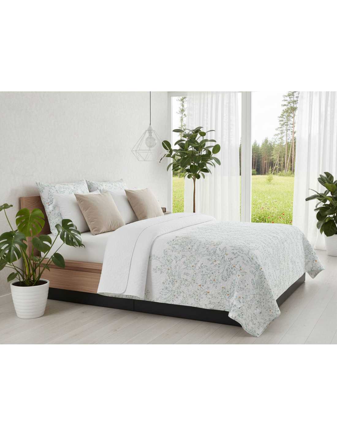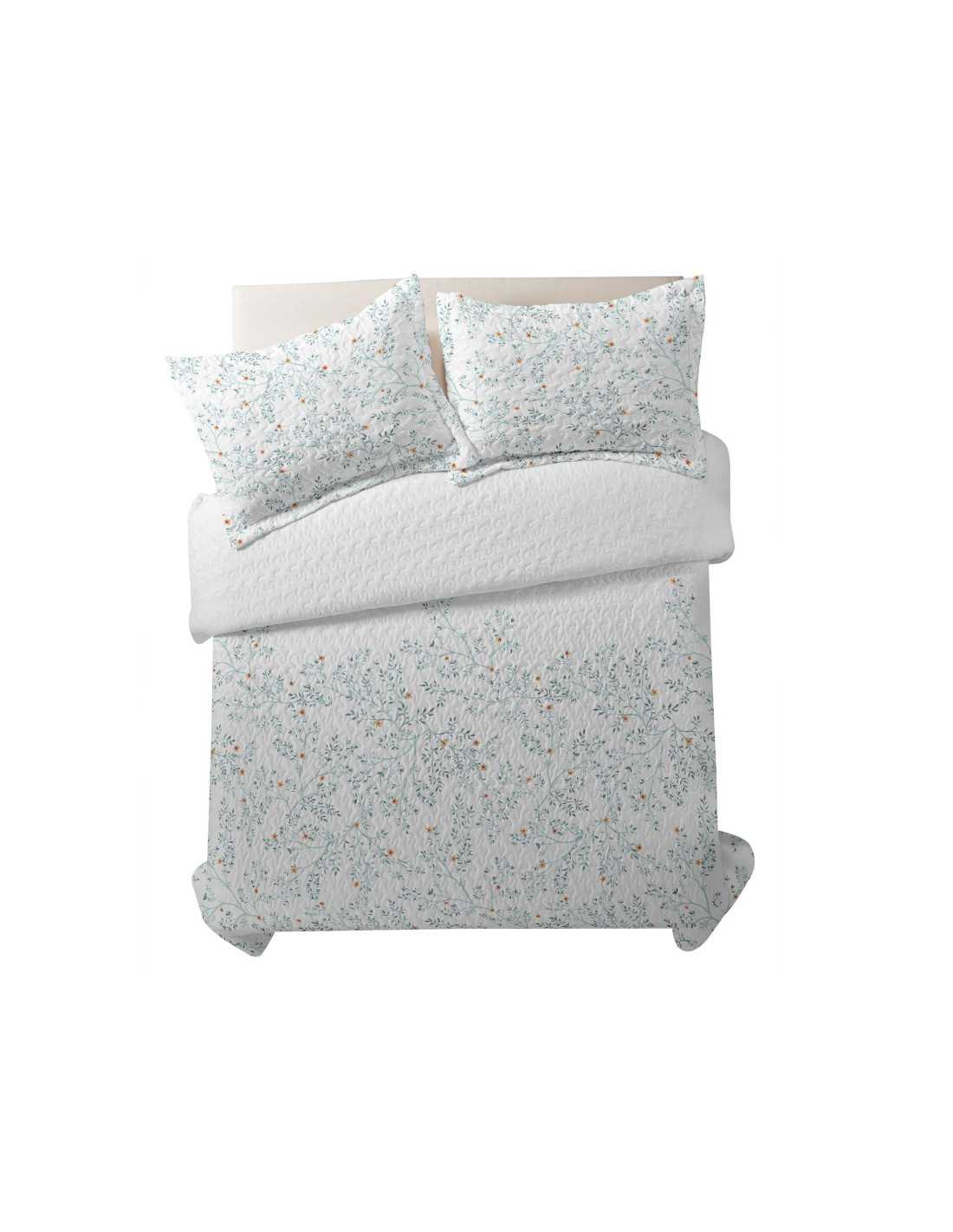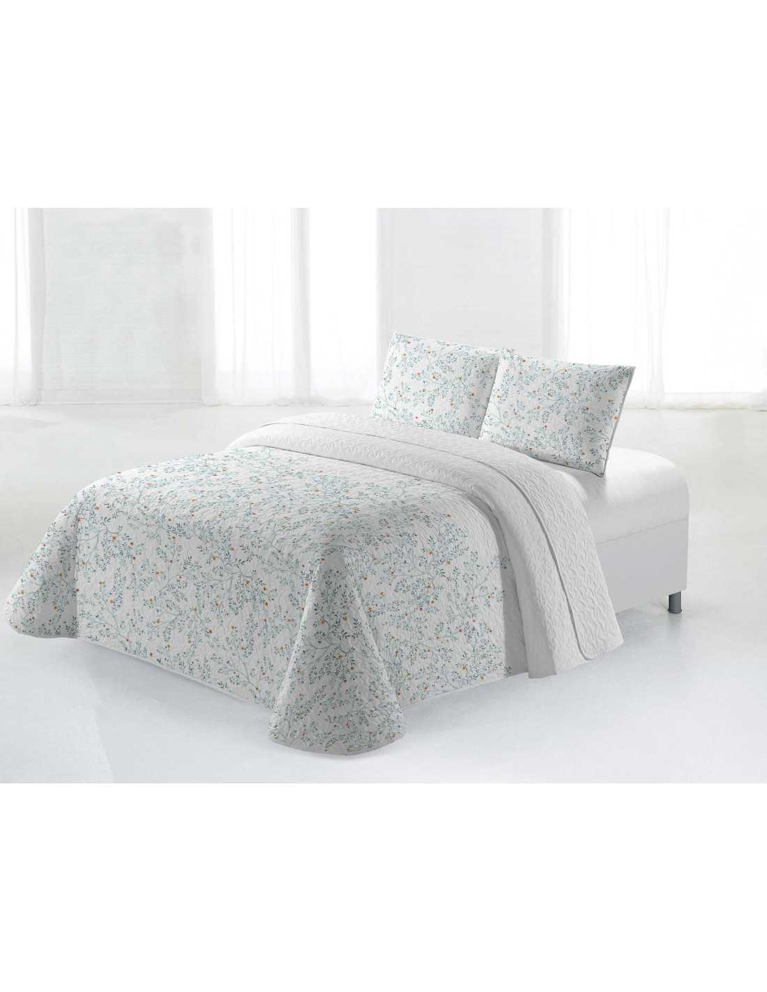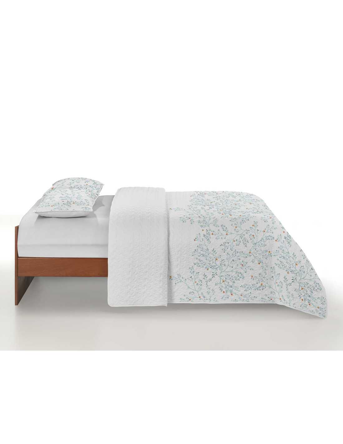 Colcha bouti de entretiempo y verano con relleno ligero. Con un diseño muy sencillo y decorativo con pequeñas flores en tonos azules.