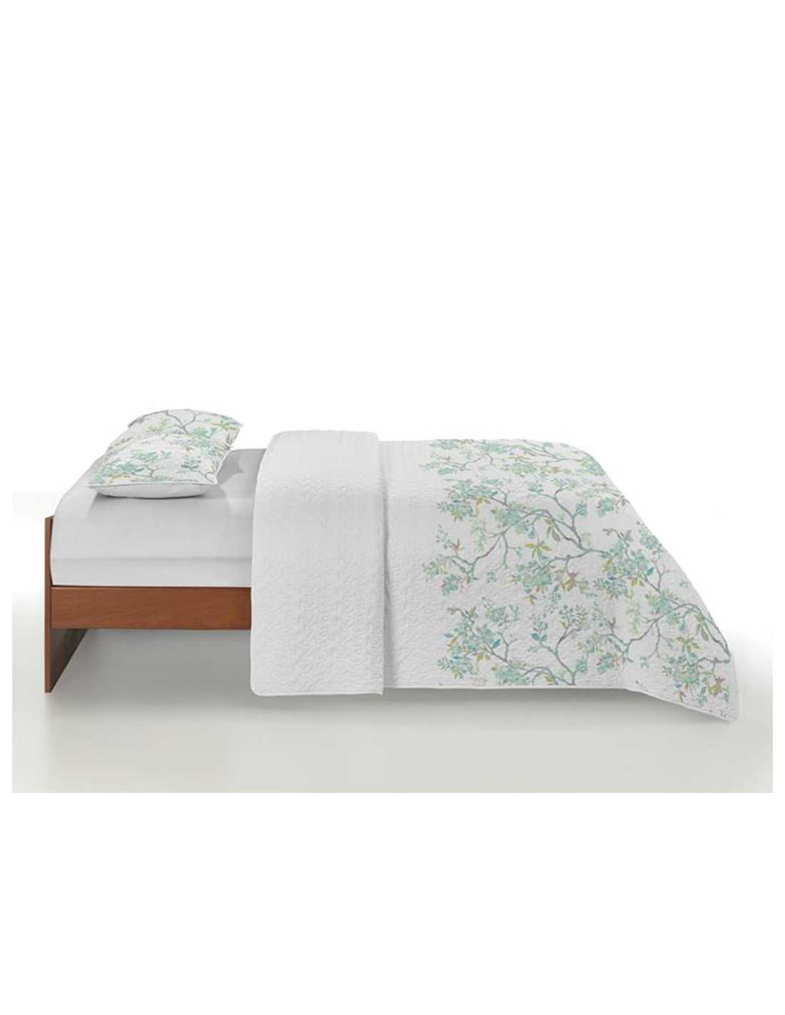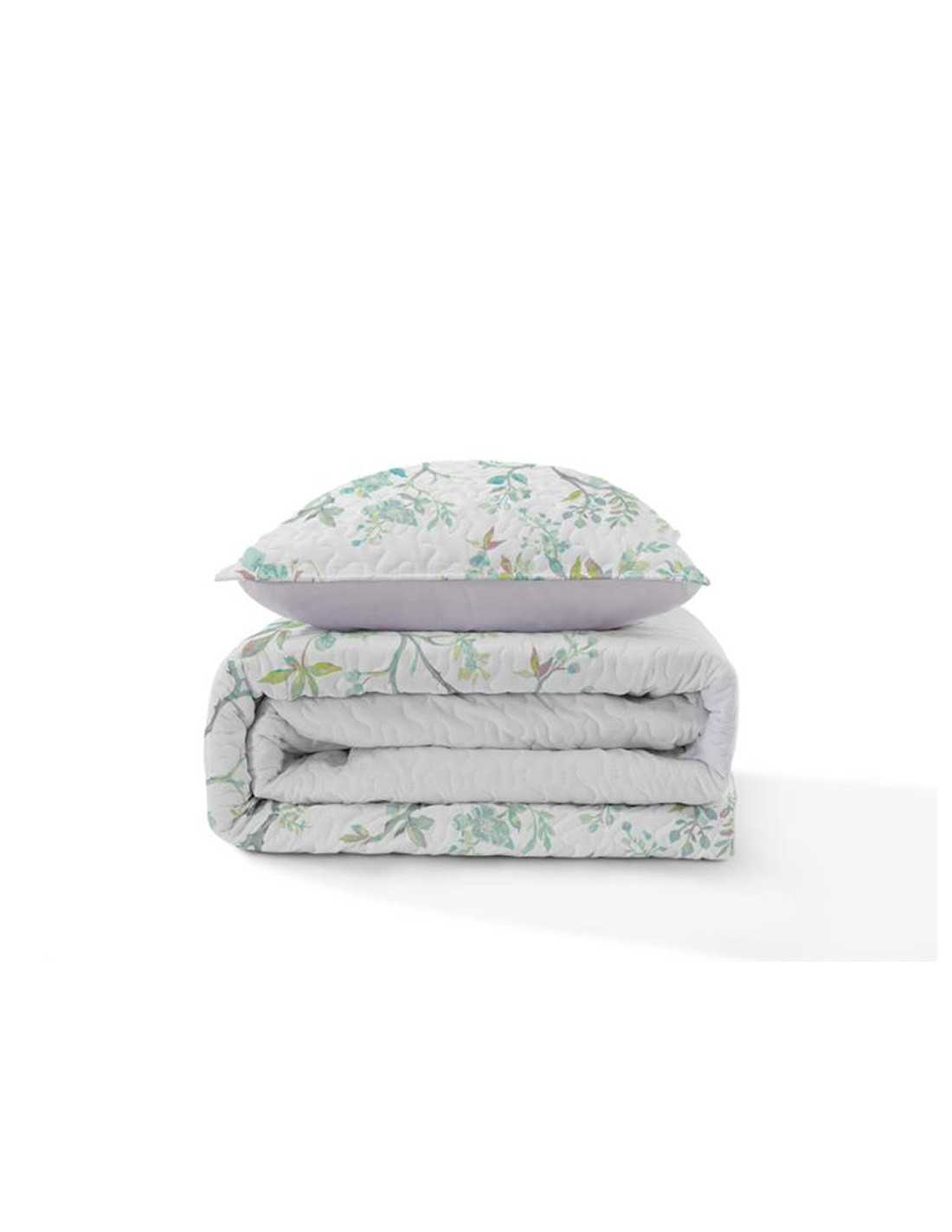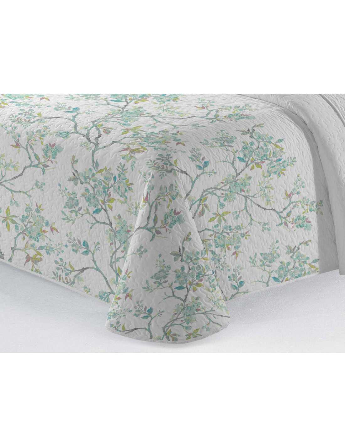 Colcha bouti con ligero relleno y un diseño natural muy freco en tonos verdes. Es ideal para el entretiempo y verano.
