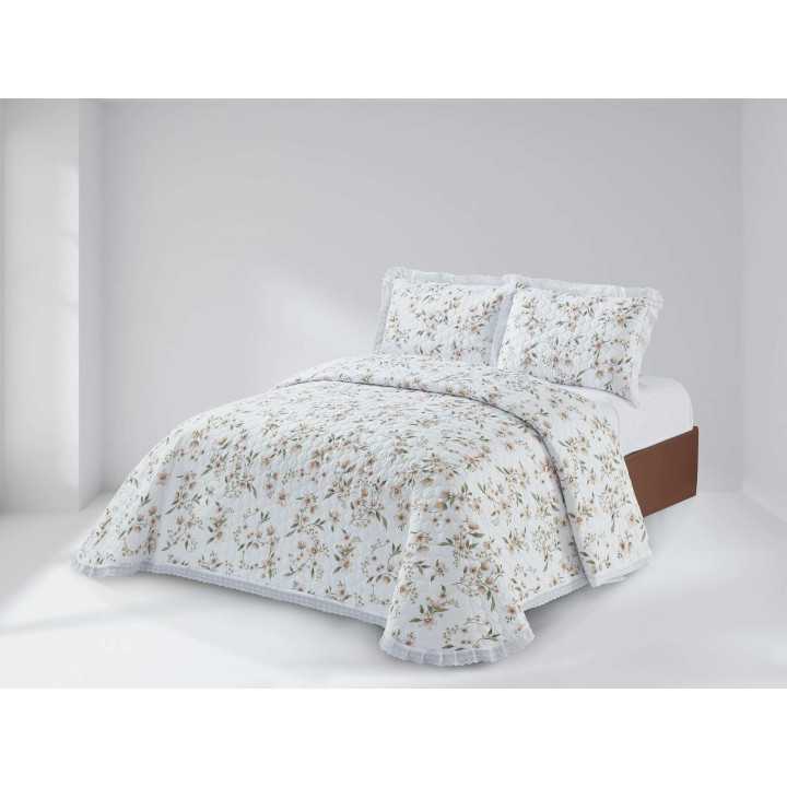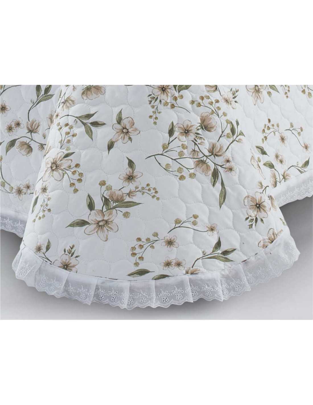 Colcha bouti de primavera y verano con diseño de flores y ribeteada con bonita puntilla. Una colcha muy elegante y decorativa ideal para dar luminosidad a tu dormitorio.