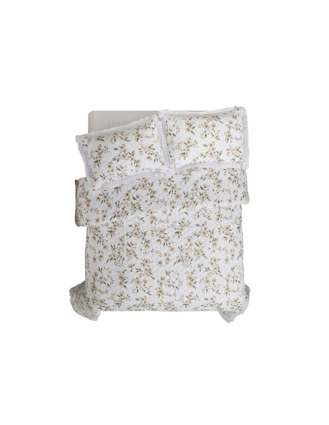Disal es una colcha con un diseño de flores en beig y hojas en verde sobre fondo blanco. Un bouti de gran elegancia, ribeteada con una bonita puntilla blanca, guateada y con un ligero relleno de 120 gramos de tacto suave y agradable.