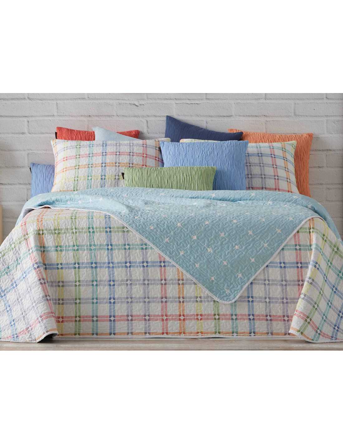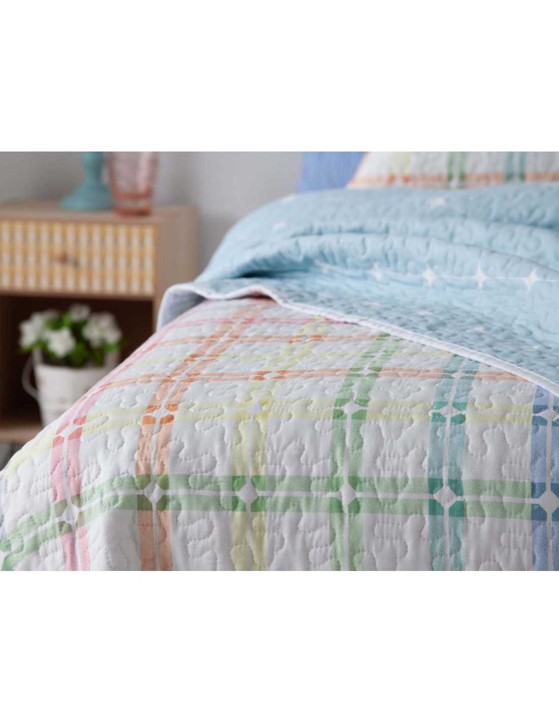 El bouti reversible Colors de Manterol es una colcha con ligero relleno con dos diseños diferentes. En una cara tiene un diseño con cuadros de colores y en el reverso un diseño sencillo de cuadros turquesas.