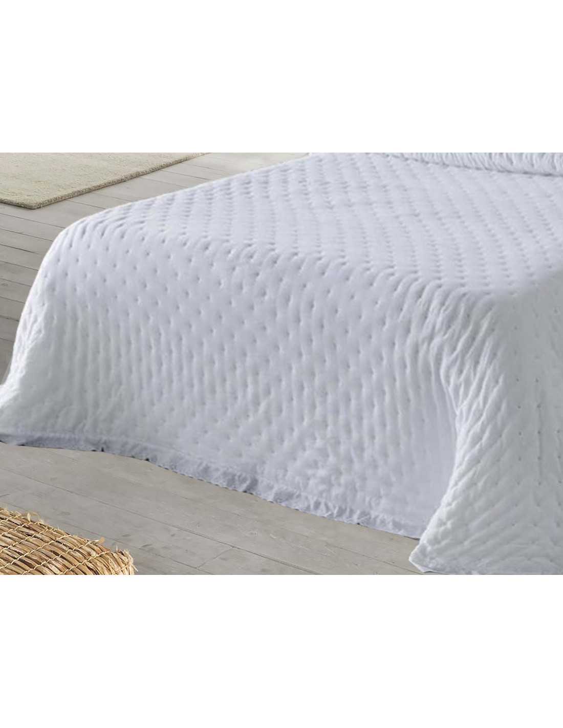 Colcha lisa de color blanco con pequeños círculos termosellados y volante con puntilla con un ligero relleno, perfecta para los meses más cálidos del año.