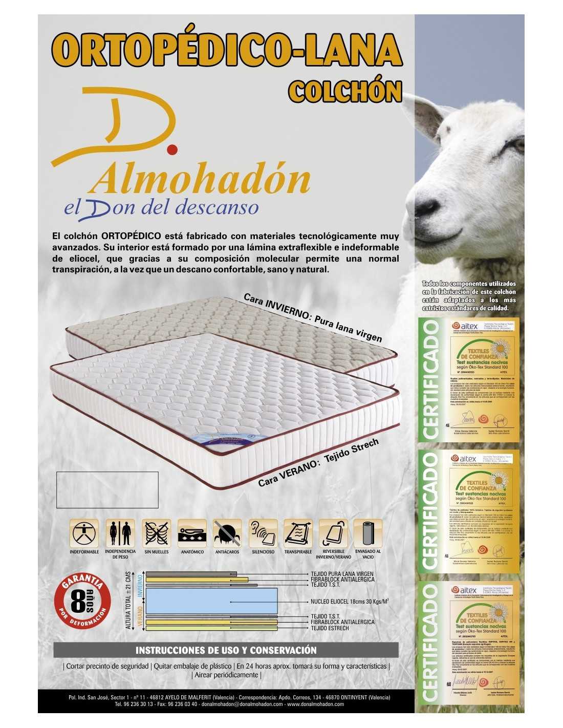 Colchón ortopédico de Don Almohadón, compuesto en su interior por un bloque de eliocel HR de estructura celular abierta que proporciona una excelente transpirabilidad. Su exterior está compuesto por dos tejidos bien diferenciados, tejido strech a una cara para el verano y tejido pura lana virgen para el invierno. La principal característica de la lana es su capacidad termoreguladora, favoreciendo una temperatura constante del cuerpo y permitiendo un agradable descanso.