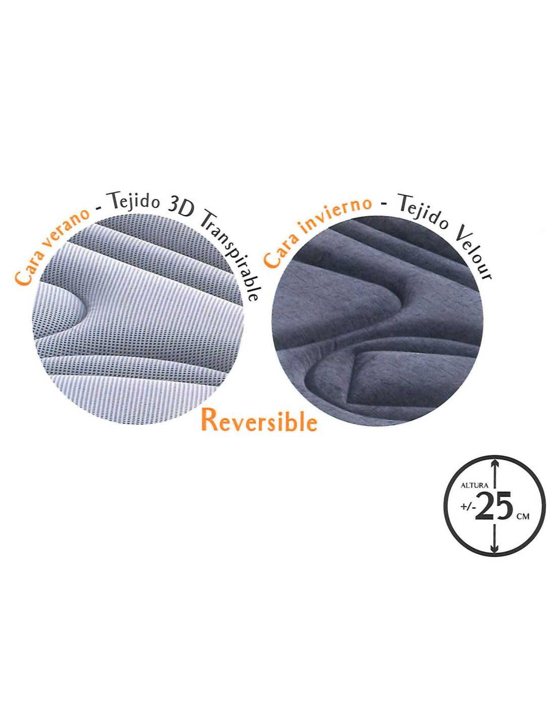 Colchón de excelente confort y calidad, fabricado con los mejores materiales para asegurar un descanso óptimo. Es reversible con una cara con tejido Velour cálido y suave, y la otra con un tejido transpirable y fresco ideal para el verano.