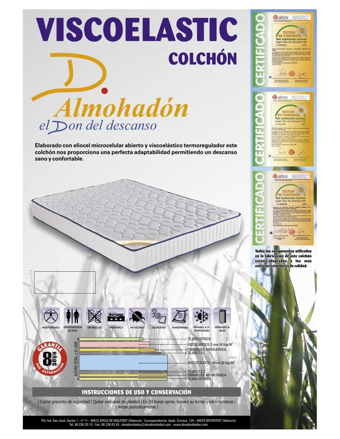 Colchón viscoelástico de Don Almohadón que conjuga la mejor opción de equilibrio entre la calidad del eliocel y la viscoelástica, termosensible a la temperatura corporal y ambiental, para ofrecernos un descanso sano y reparador. Por su perfecta adaptabilidad se consigue evitar tensiones musculares.