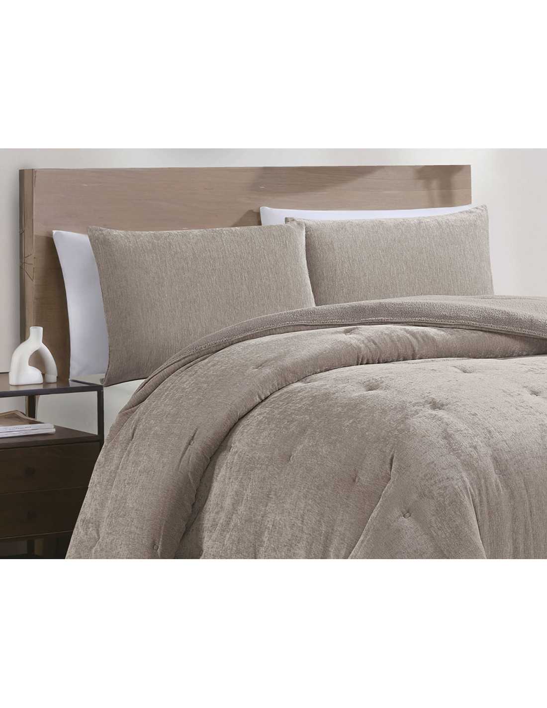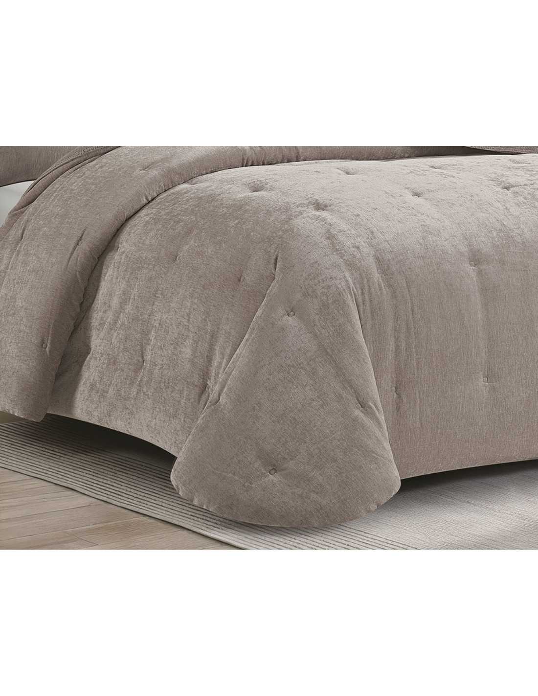 El modelo Alpes es un edredón acolchado de tejido chenilla de tacto terciopelo en color visón. Tiene un tejido de gran suavidad y calidez, y un reverso de cálido borreguito.