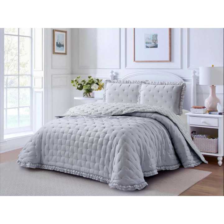 Elegante y decorativo edredón reversible Wendy color gris de Dolz con doble volante y relleno de 300 gramos. Decora y abriga tu dormitorio esta temporada.