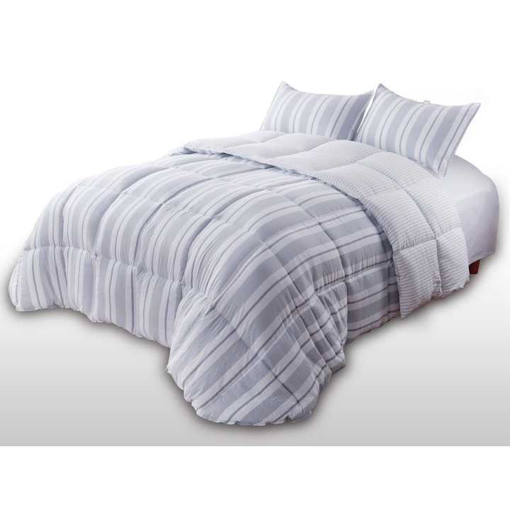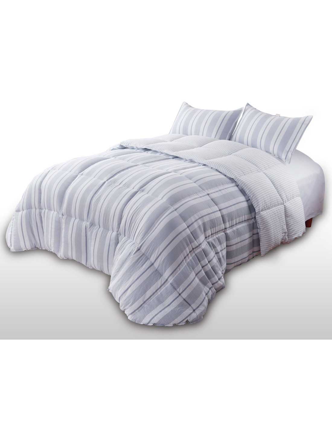 El edredón Samara es lun conforter fresco y moderno con un diseño de rayas en tonos grises. Con un relleno de 300 gramos esta recomendado para el los meses más fríos del año.