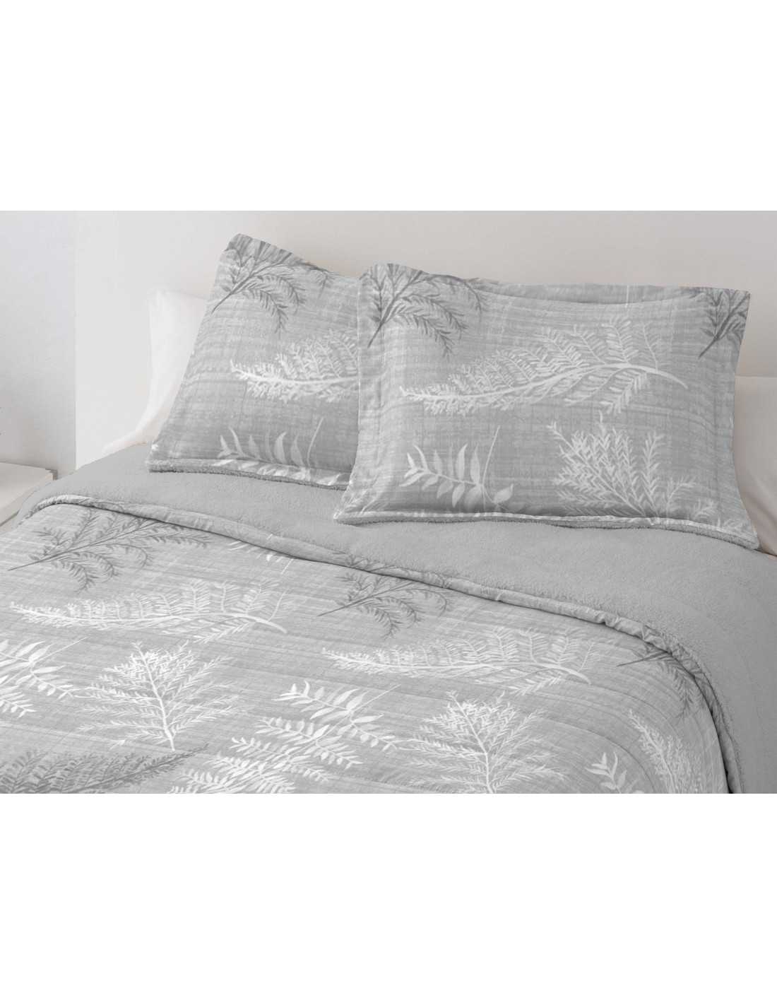 Edredón de sedalina y borreguito en tono gris con un elegante estampado de hojas sobre fondo gris. Gramaje total 620 gramos.