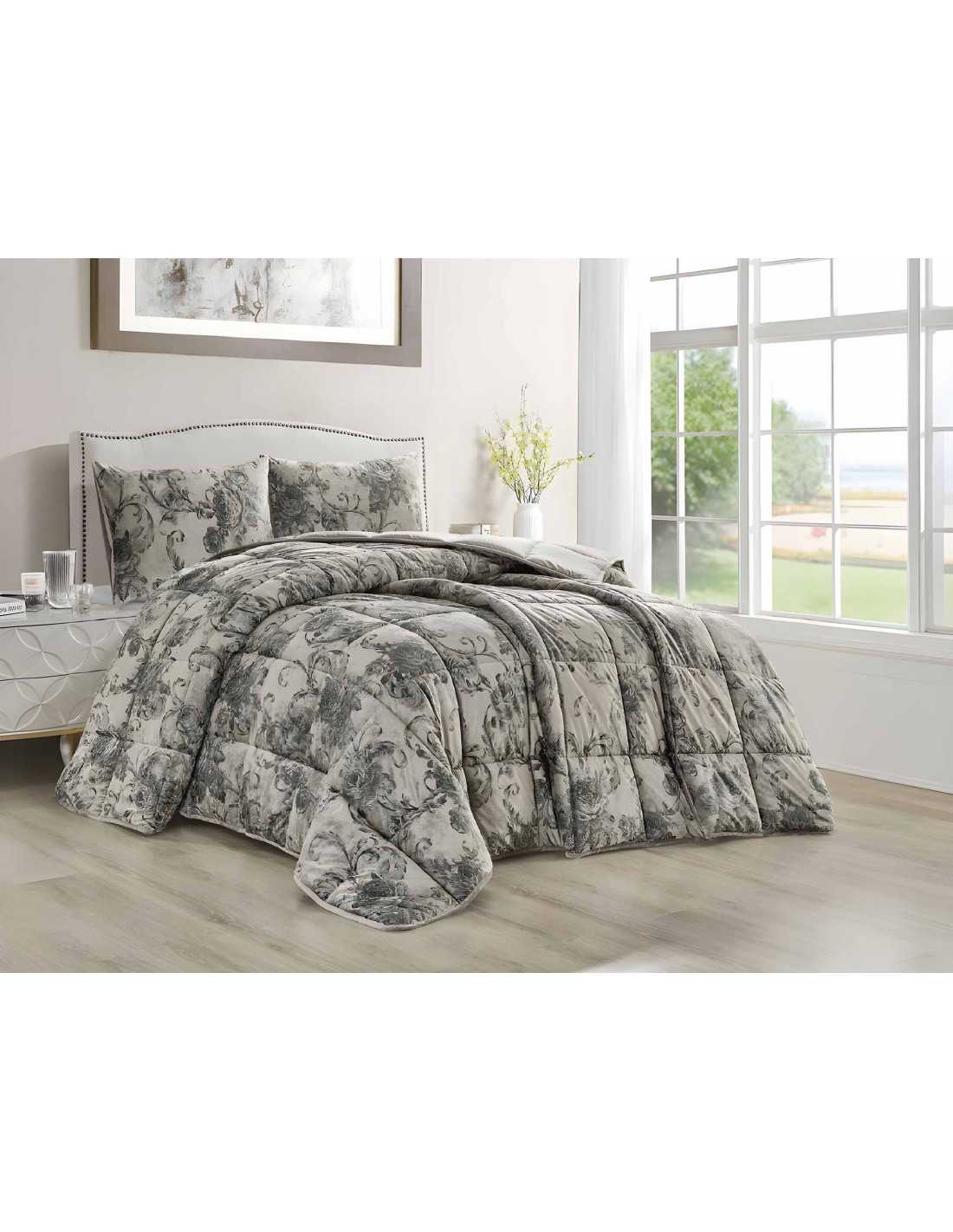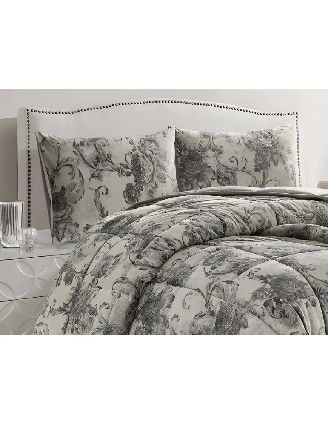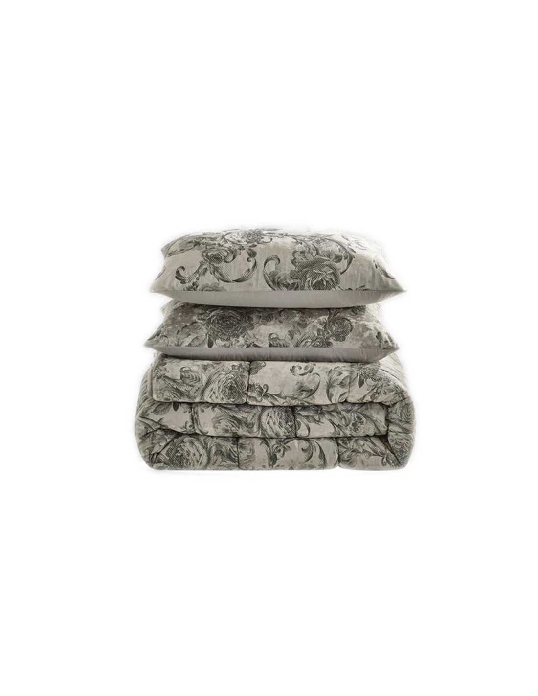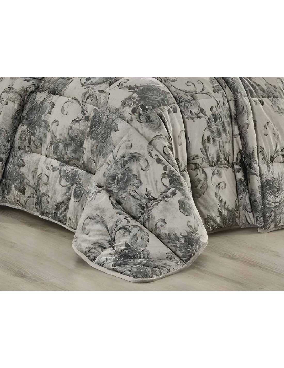 Edredón de terciopelo impreso con motivos florales y botánicos de estilo clásico en gris oscuro sobre fondo topo. Gramaje total 610 gramos.