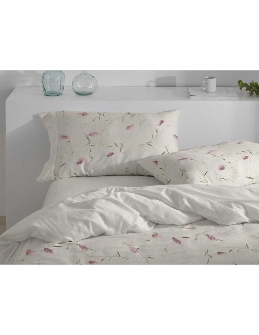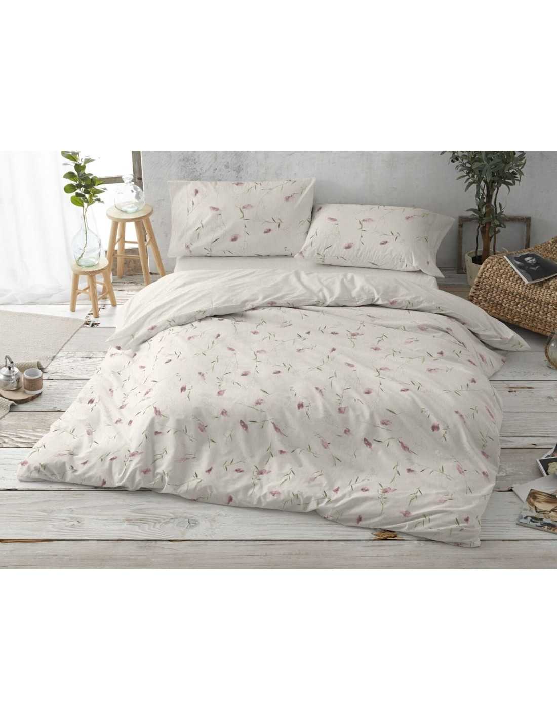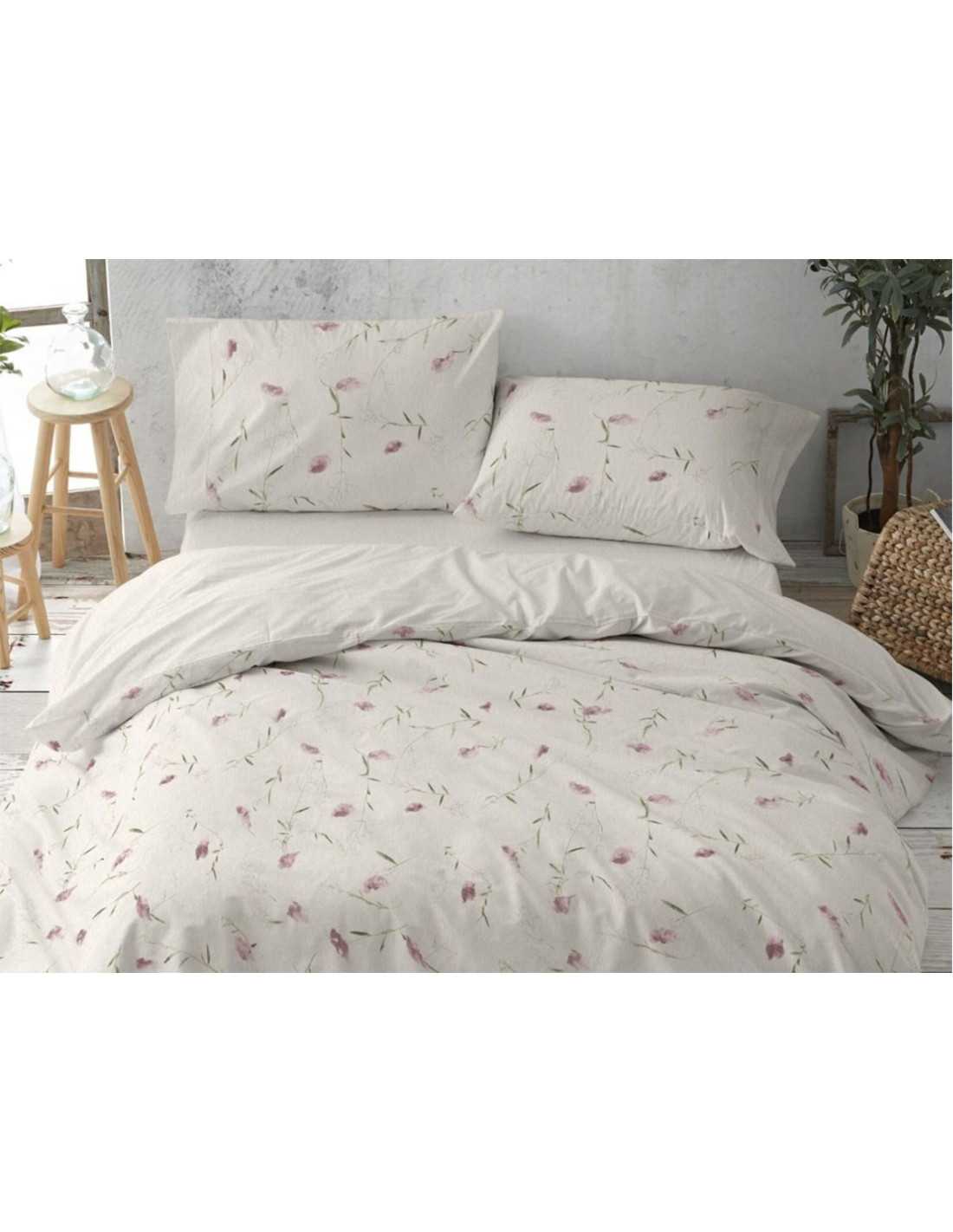Funda nórdica de Burrito Blanco modelo Linfa en color rosa con precioso diseño botánico. Un juego de sábanas con encimera, bajera y almohadón.