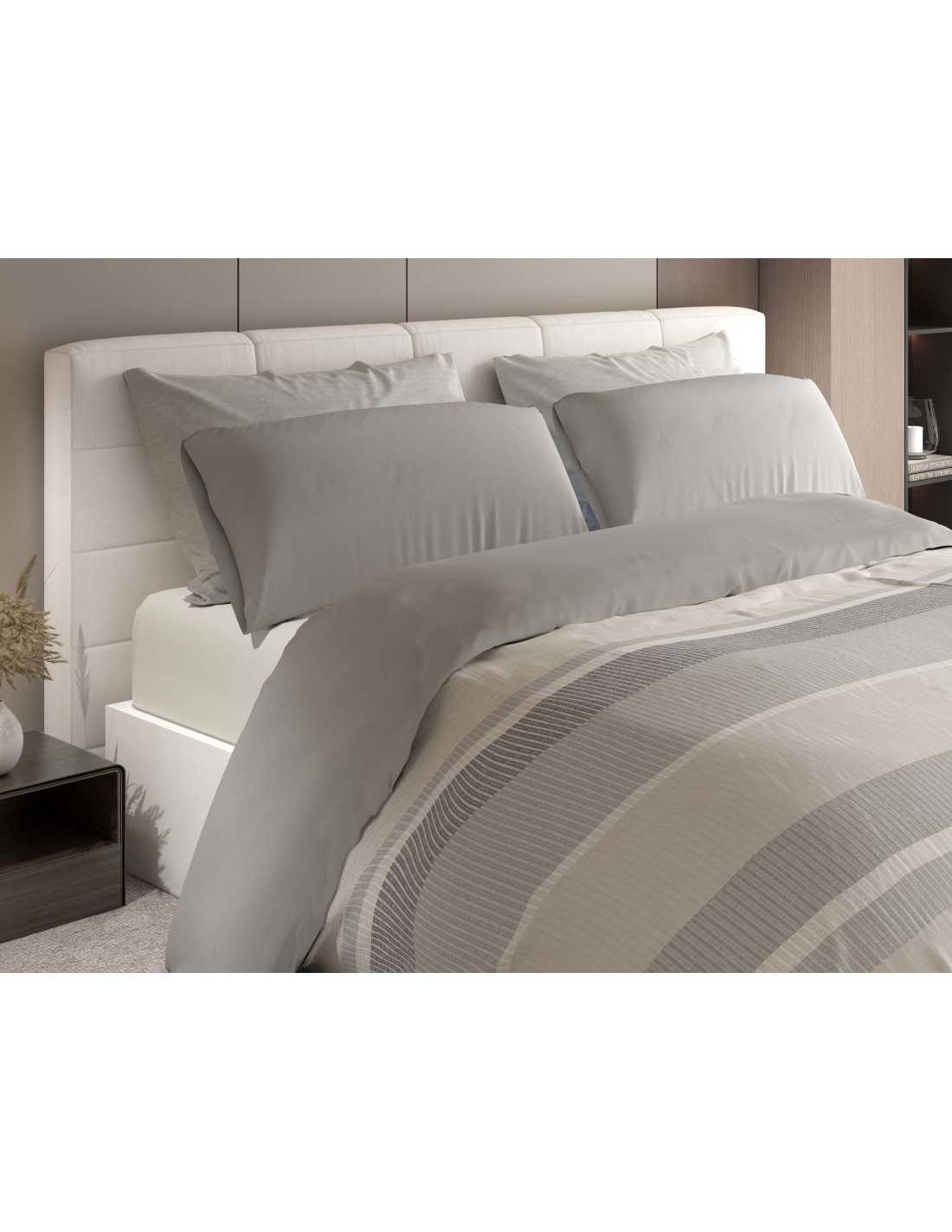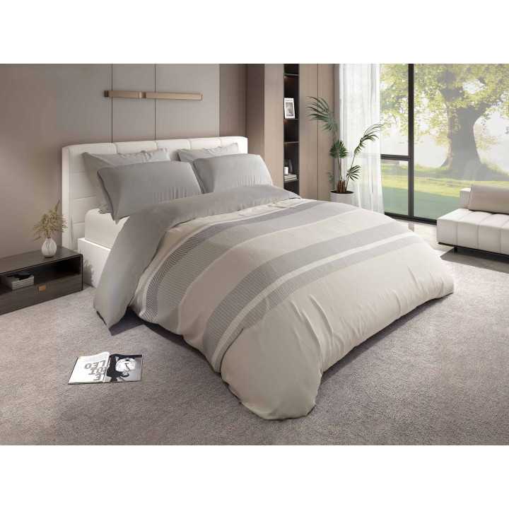 El modelo Born es una funda nórdica de 3 piezas con un diseño de franjas con líneas. El reverso de la funda y los almohadones son de color gris, y la bajera es de color beige. Un diseño para crear un espacio único en tu dormitorio.