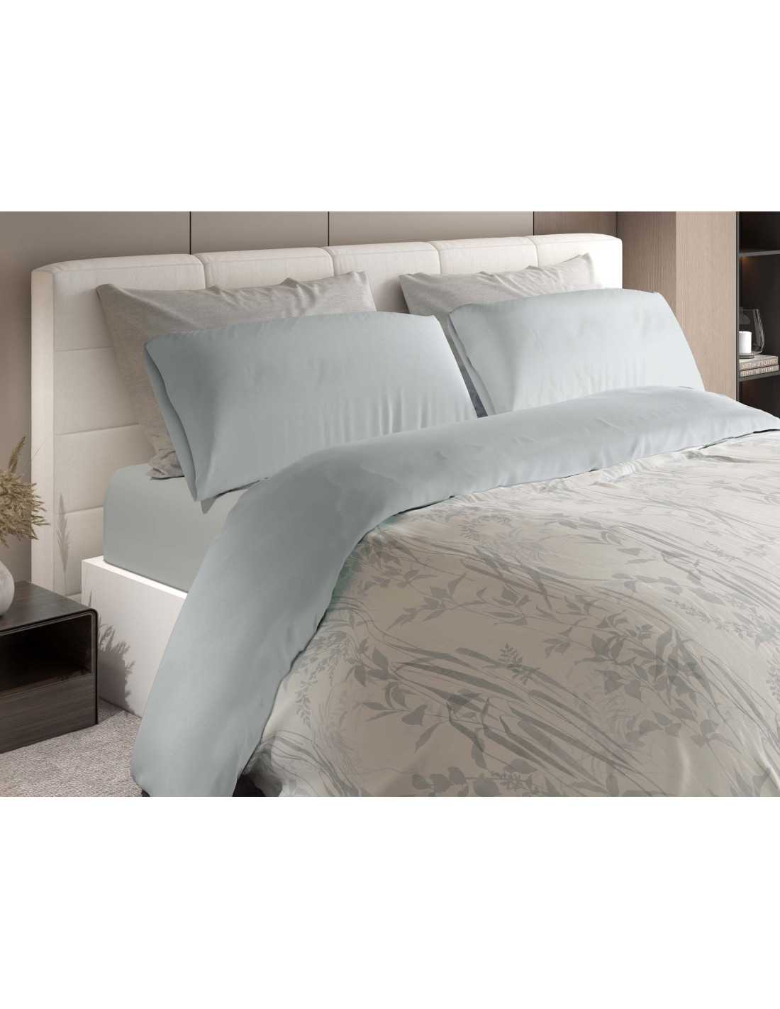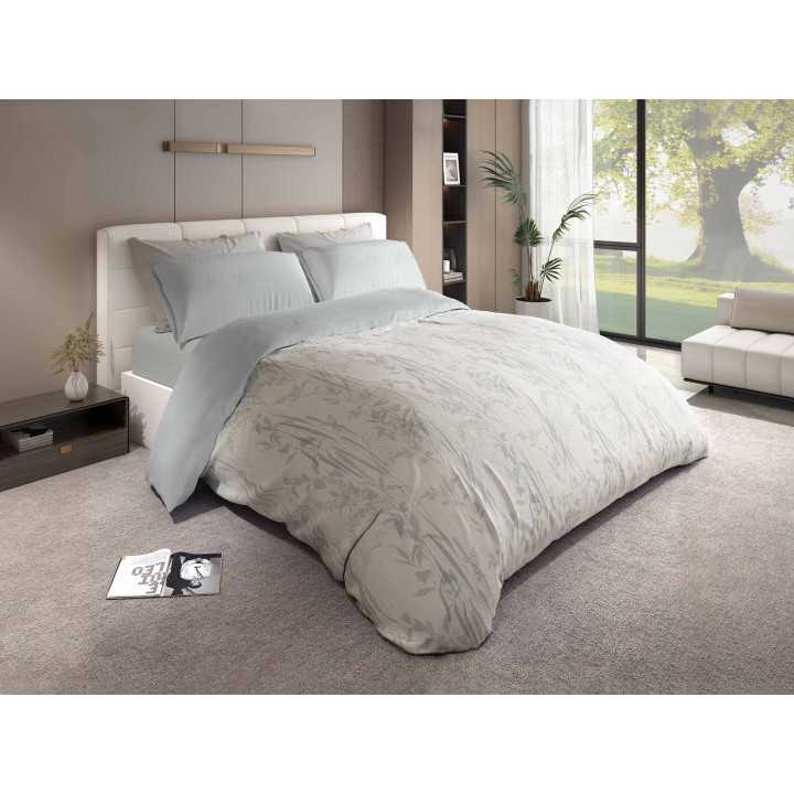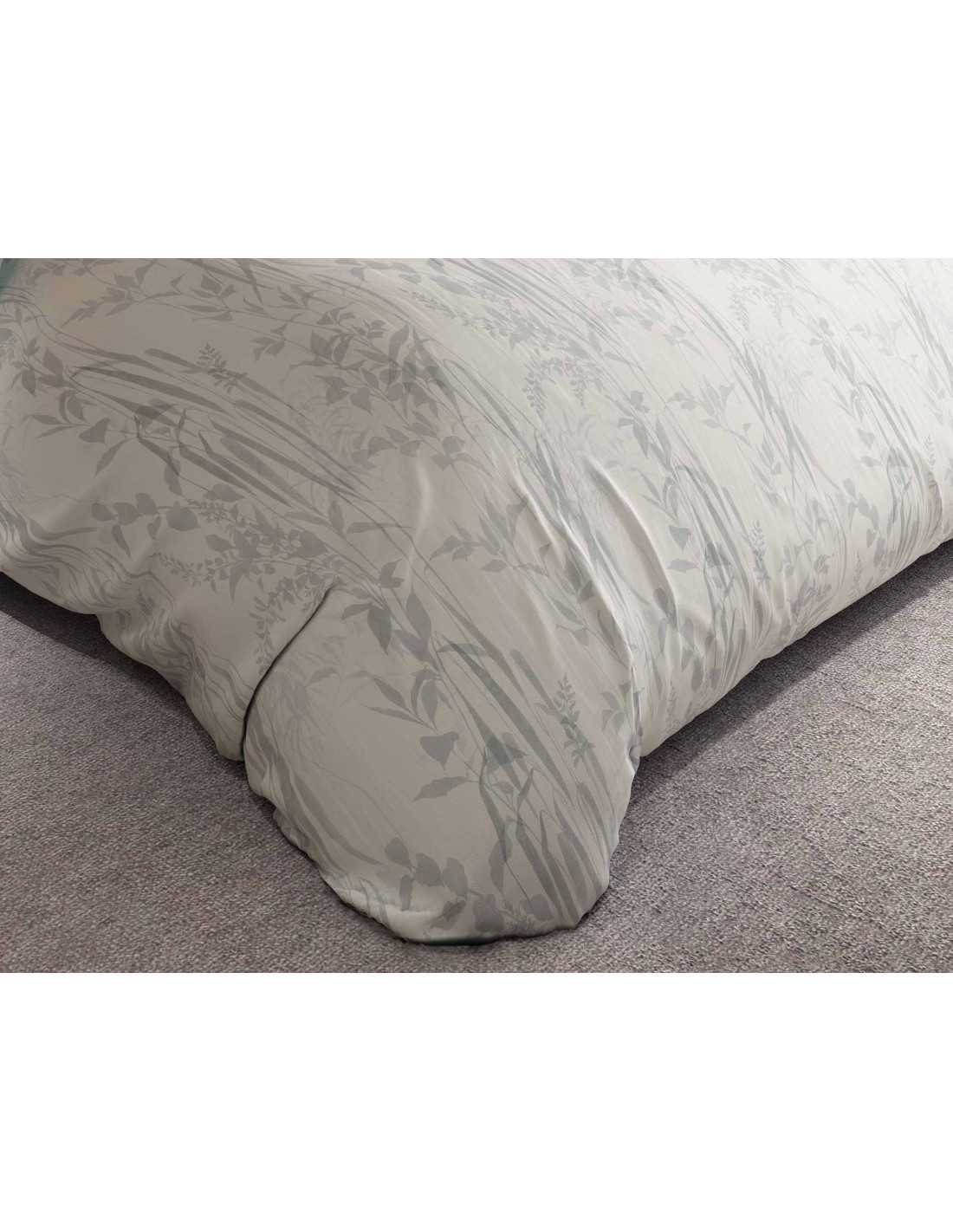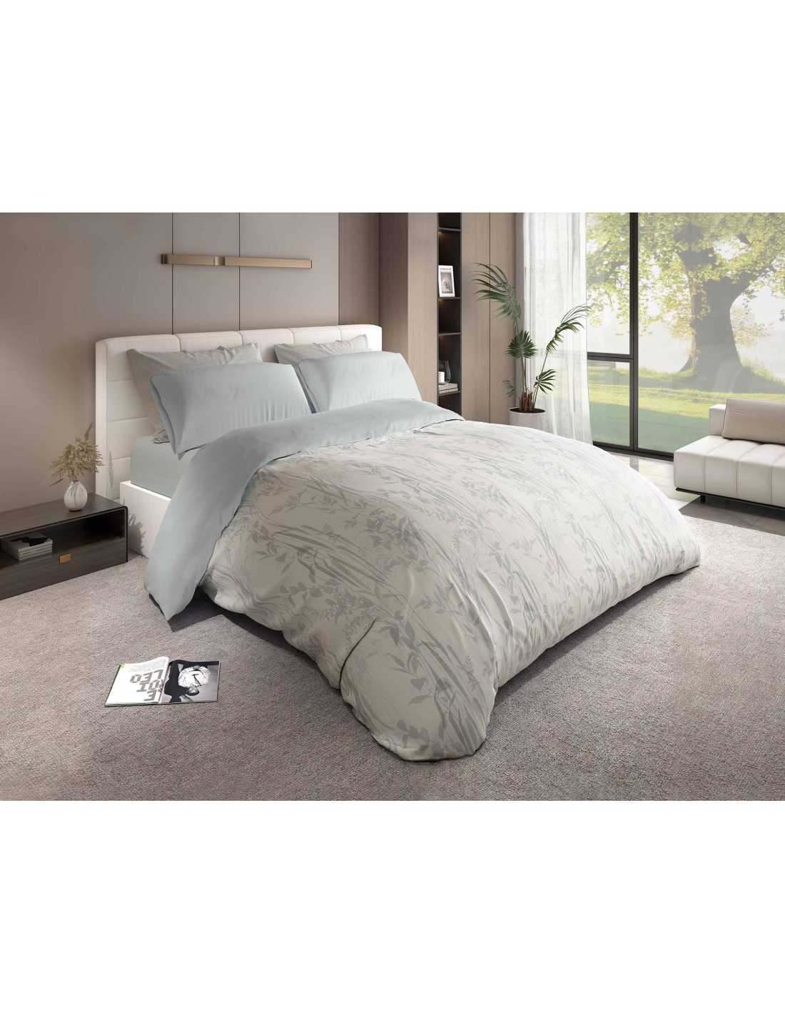Juego de funda nórdica de 3 piezas con un decorativo diseño vegetal en plomo con reverso, bajera y almohadones en color plomo.
