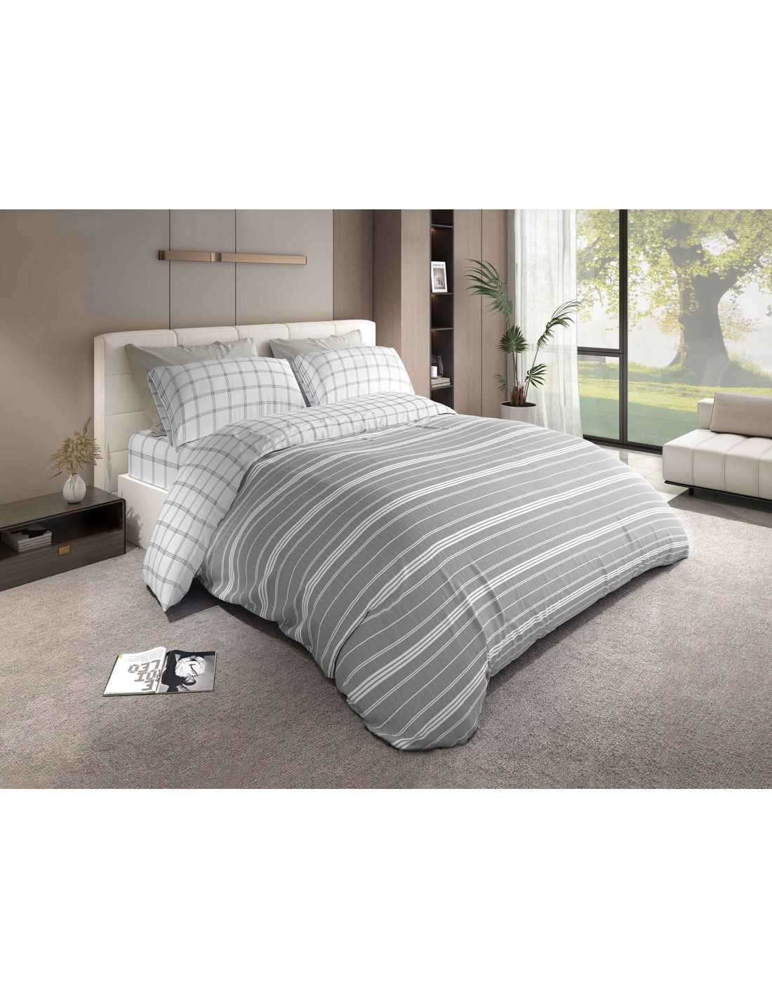 Juego de funda nórdica de 3 piezas con un alegre diseño de rayas en tonos grises con reverso, bajera y almohadones con cuadros grises.