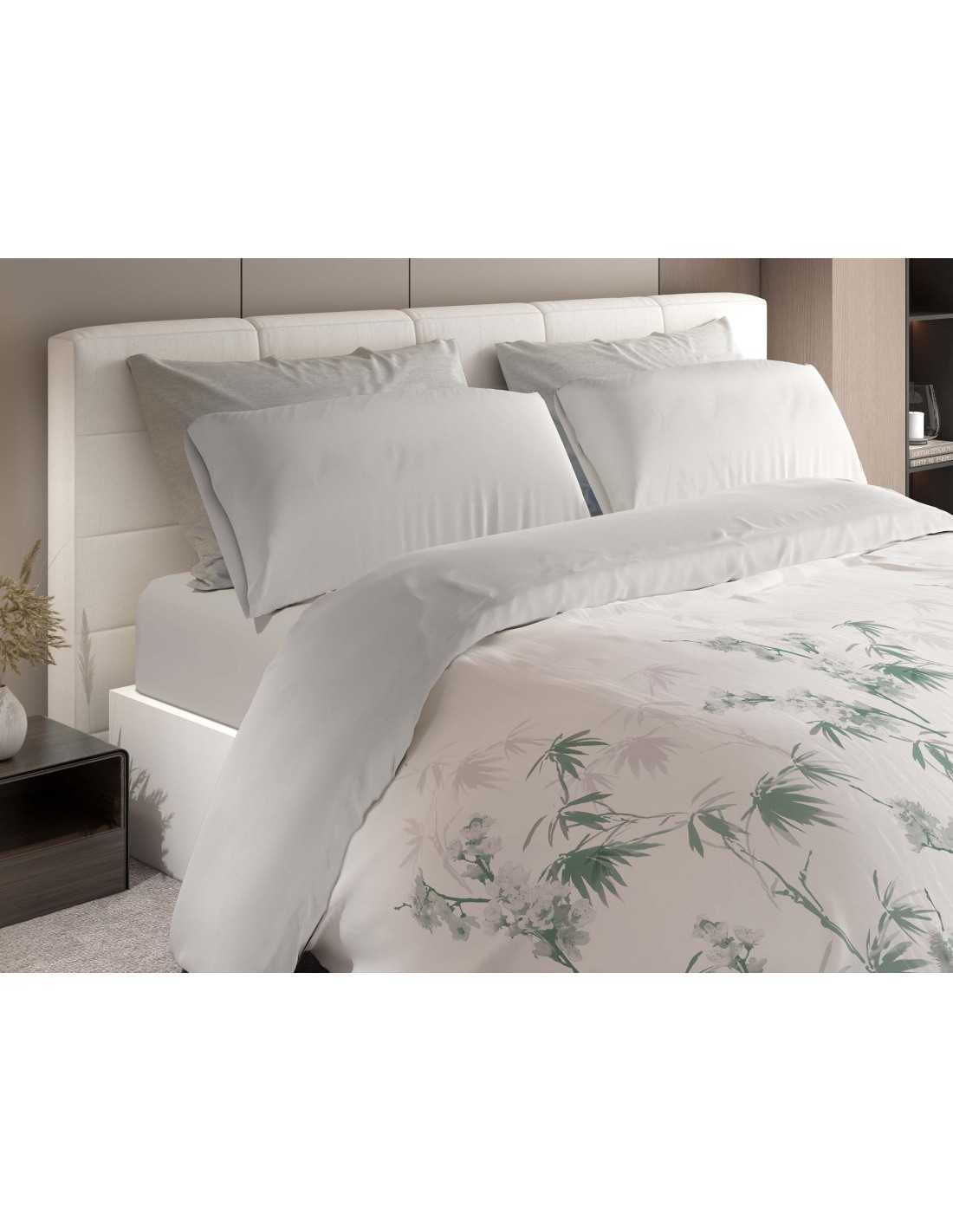El modelo Kyoto es una funda nórdica de 3 piezas con un diseño inspirado en la naturaleza con motivos botánicos en tonos verdes. El reverso de la funda, los almohadones y la bajera son de color gris. Un diseño perfecto para decorar tu dormitorio.