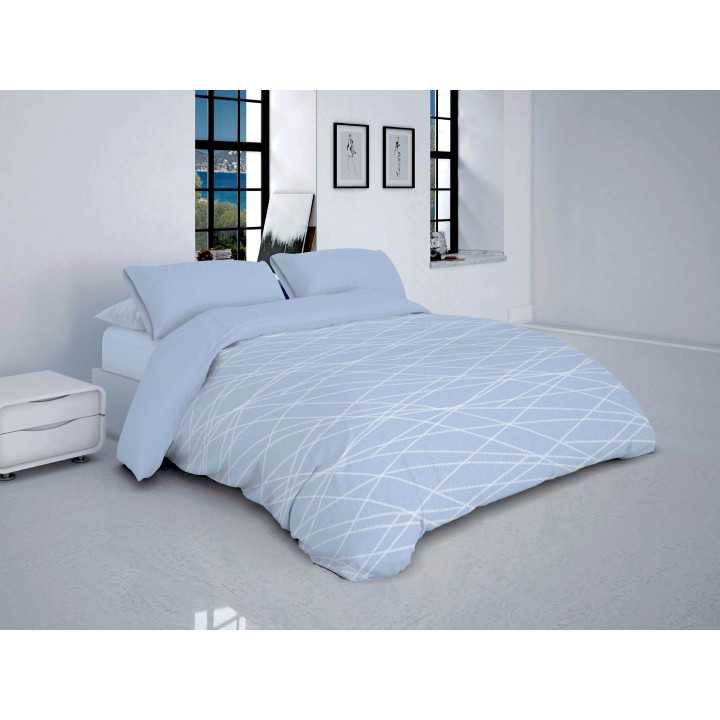 Juego de funda nórdica de 3 piezas con un diseño sencillo de rayas sobre fondo azul. Incluye encimera, bajera y almohadón.