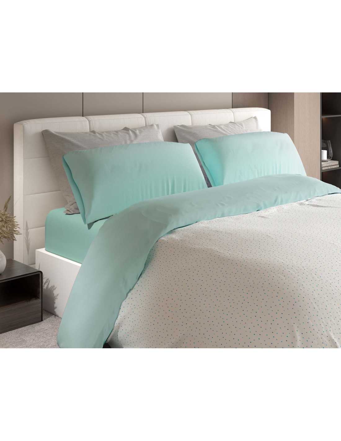 Juego de funda nórdica de 3 piezas con un precioso diseño de puntitos multicolor con reverso, bajera y almohadones en color agua.